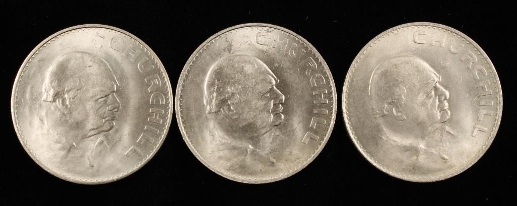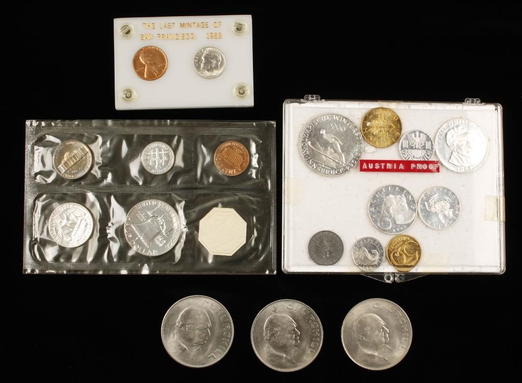 3 Winston Churchill British Crowns. 1965 Commemorative coins with Queen Elizabeth on the face and Sir Winston Churchill on the reverse. A 1961 proof set from the United States Mint in Philadelphia. A set consisting of a wheat penny and a dime in a case labeled " The Last Mintage of San Francisco, 1955". An Austrian Proof Set from 1964 consisting of 9 coins.