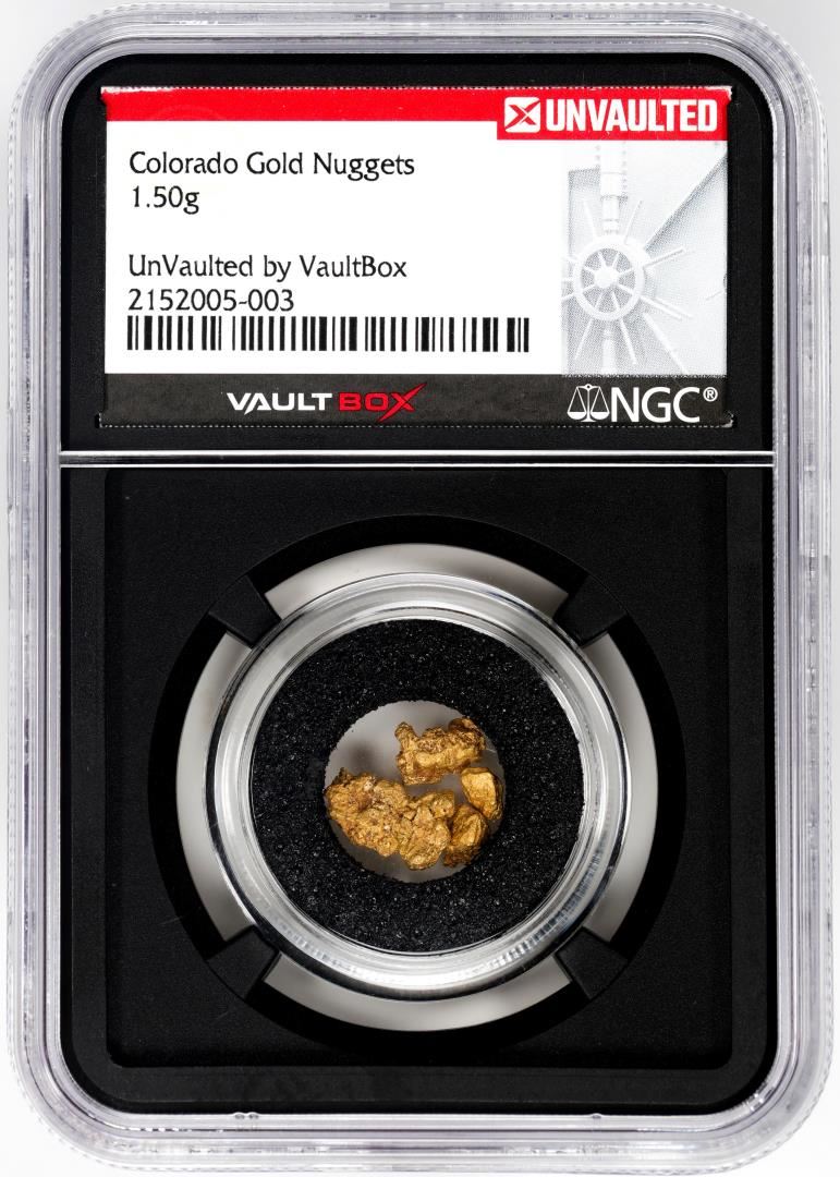 One Lot of Colorado Gold Nuggets 1.50 Grams Total Weight NGC Vaultbox Unvaulted. NGC Certified.