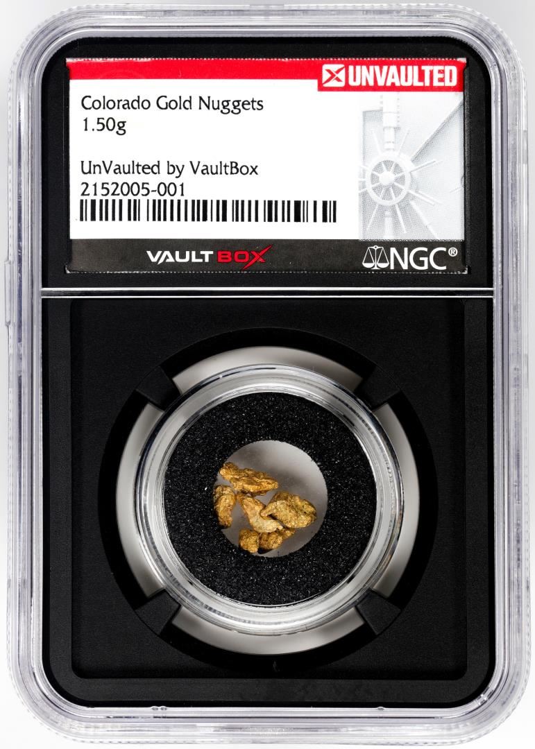 One Lot of Colorado Gold Nuggets 1.50 Grams Total Weight NGC Vaultbox Unvaulted. NGC Certified.