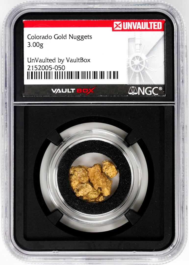 One Lot of Colorado Gold Nuggets 3.00 Grams Total Weight NGC Vaultbox Unvaulted. NGC Certified.