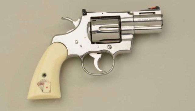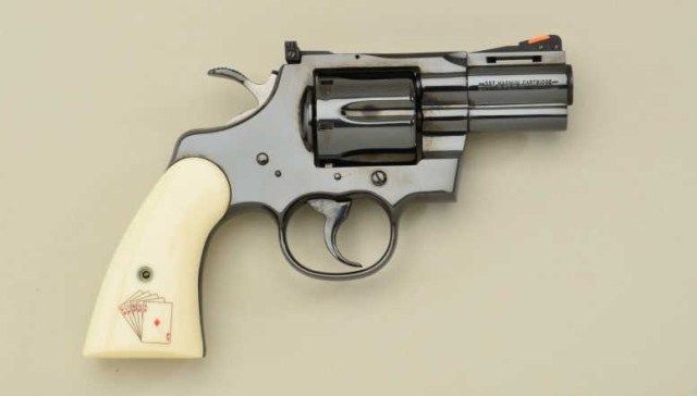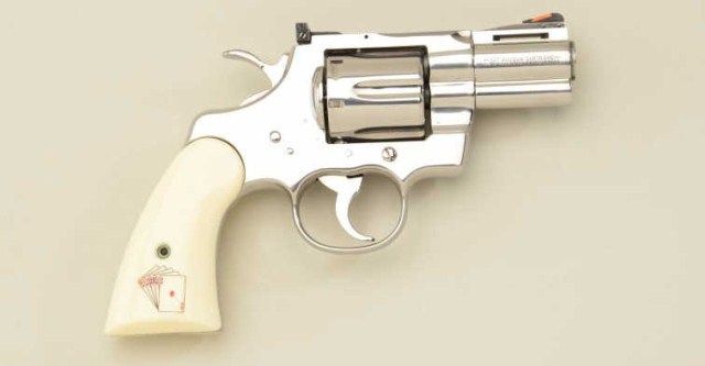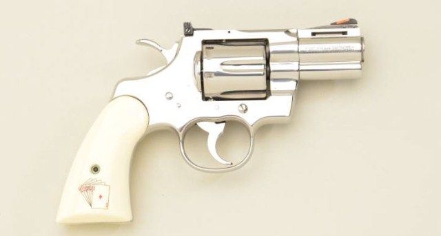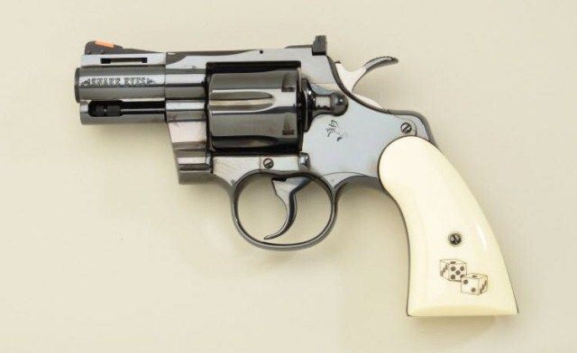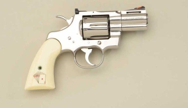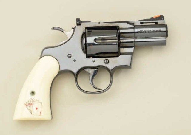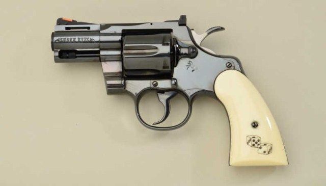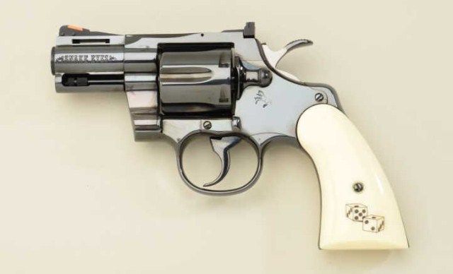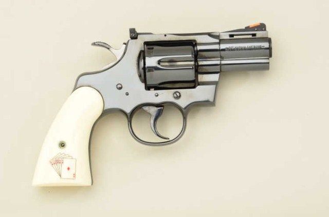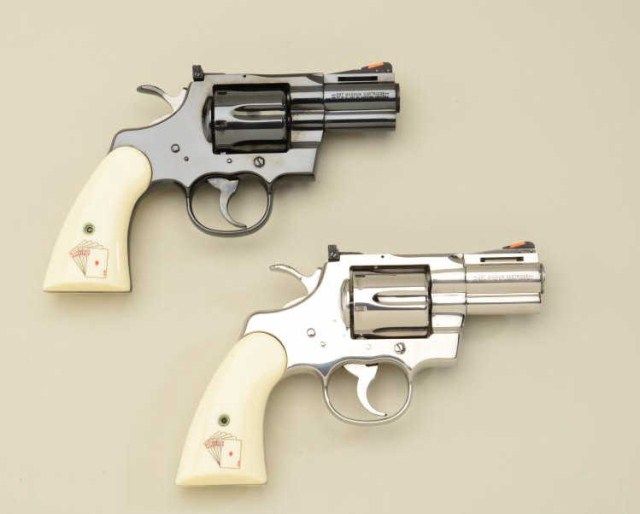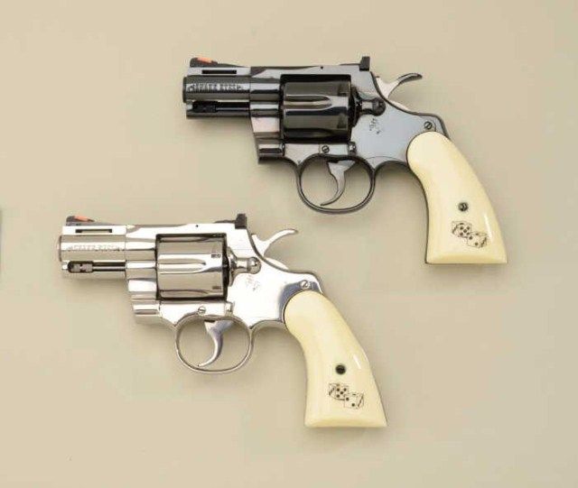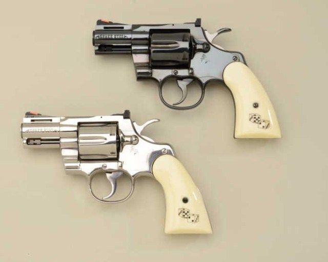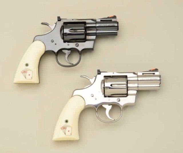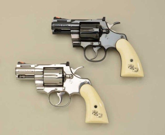 Lot of Colt Snake Eyes 357 magnum double action revolvers, 2-1/2” barrels, serial #’s 001EYES & EYES001 in blue finish and polished stainless steel showing dice and snake based on Python design. This pair is the firstproduction number in the series and was retained by Colt Firearms for their archive and collection. Original sold by Butterfield & Butterfield lot #6551 to the Robert E. Petersen collection. The pistols are inexcellent condition and in original cardboard boxes with matching end labels. Possible test firing only. 99% plus condition. Serial number 1 is always desirable to major Colt collectors Robert E. Petersen collectionEst.;$5,000-$10,000. Plus