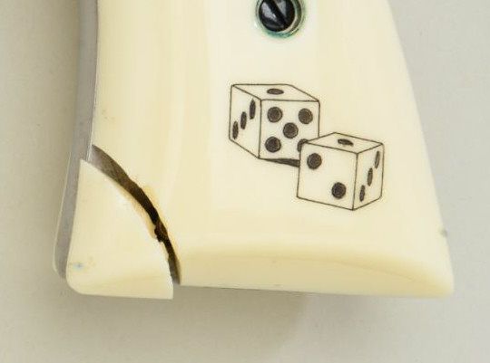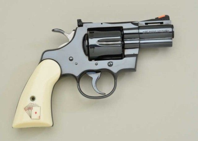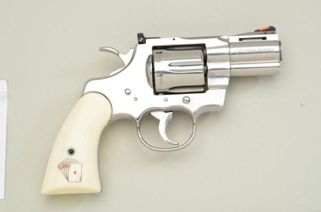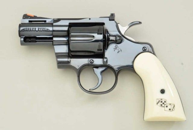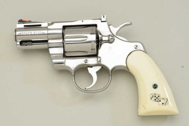 Lot of Colt Snakes Eyes 357 magnum double action revolvers, 2-1/2” barrels, serial #’d EYES002 in blue finish with composite grips showing dice and snake and matching high polished stainless revolver serial #’d002EYES. Based on Python design both pistols are in fine to excellent condition. 99% plus except stainless steel revolver shows chip and repair to inside toe of left grip. Formerly sold by Butterfields & Butterfieldsfrom the Colt archives collection lot #6551. Only serial #1 is lower than this set. Robert E. Petersen collection. Est.;$2,500 - $10,000.