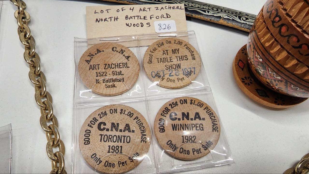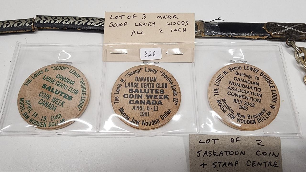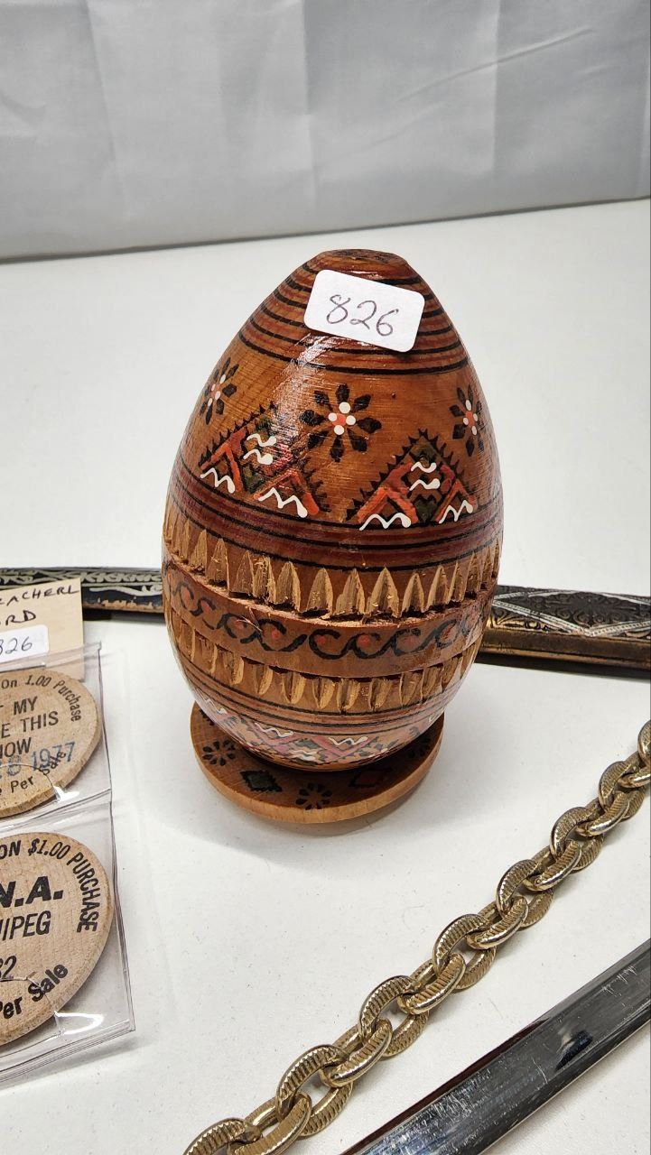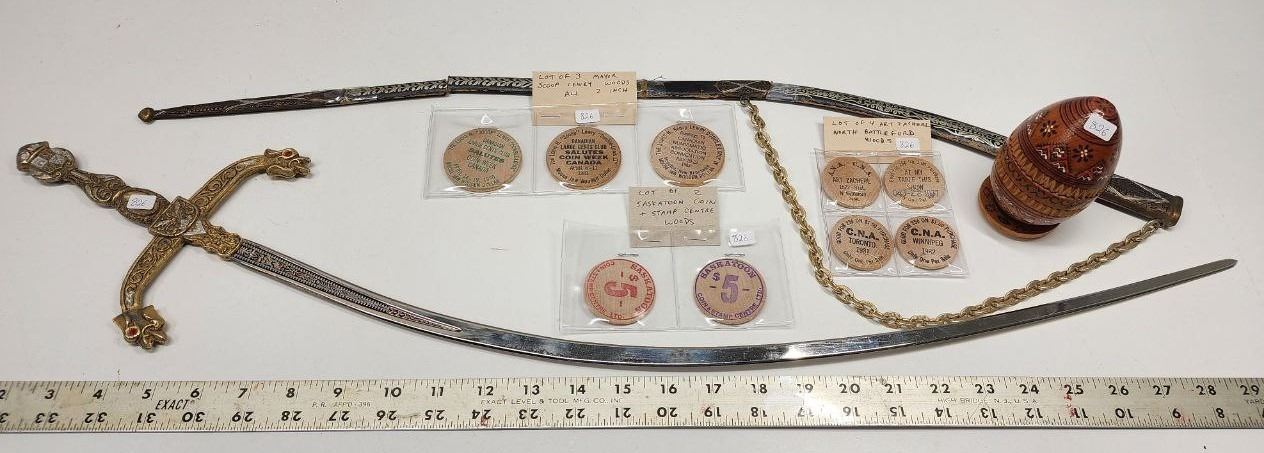 Lot of Decorative Items, Sword with Sheath (Sheath is ripped in a few places), Wooden Tokens and Ukranian wooden egg