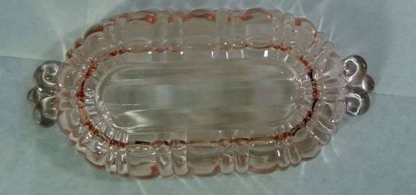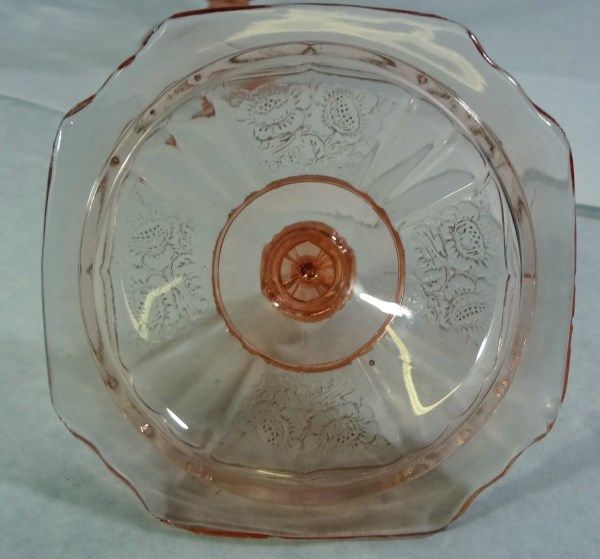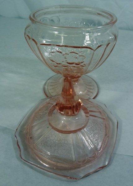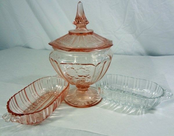 Excellent vintage condition. The candy dish lid has a couple of chips along the edge. Rose pattern pressed glass. The two smaller dishes are in excellent condition with no cracks or chips. One is clear glass, the other dusty rose.