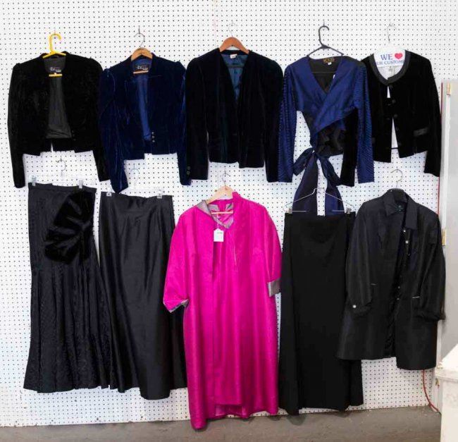 Including Koos Van Den Akker, NY black and blue silk wrap dinner jacket; Susanne Spatt Salzburg evening jacket with rhinestone trim and buttons, size 44; J. McLaughlin wool blazer with velvet collar, size 10; Koos Van Den Akker, NY black silk and velvet mermaid skirt, size M; Krizia blue velvet evening jacket, made in Italy, size 44; Gössi black velvet evening jacket with silk trim; Gössi black a-line floor-length wool skirt, size 42; Gössi black dupioni silk a-line skirt; EinTostmann Modell black velvet paisley burnout blazer, size 38; Ein Tostmann Modell blue velvet 3-button waist jacket, size 40; custom-made pink silk tunic and matching jacket with knot button and silver organza trim. (4165)