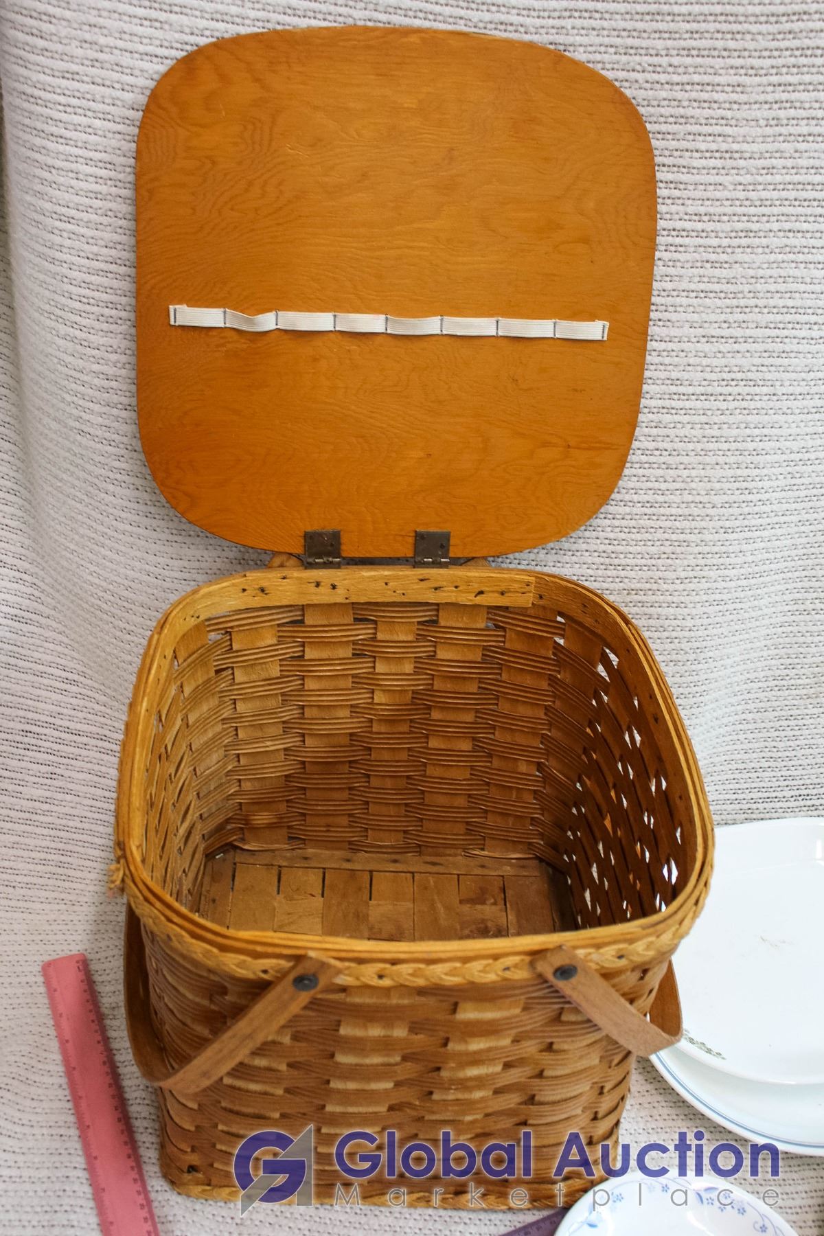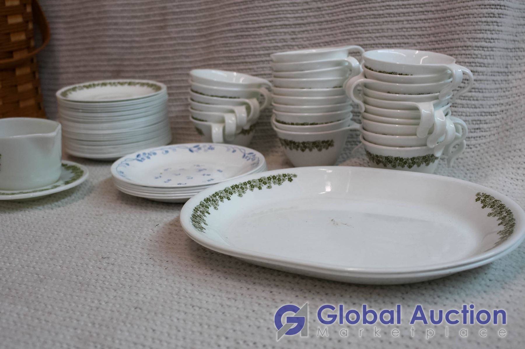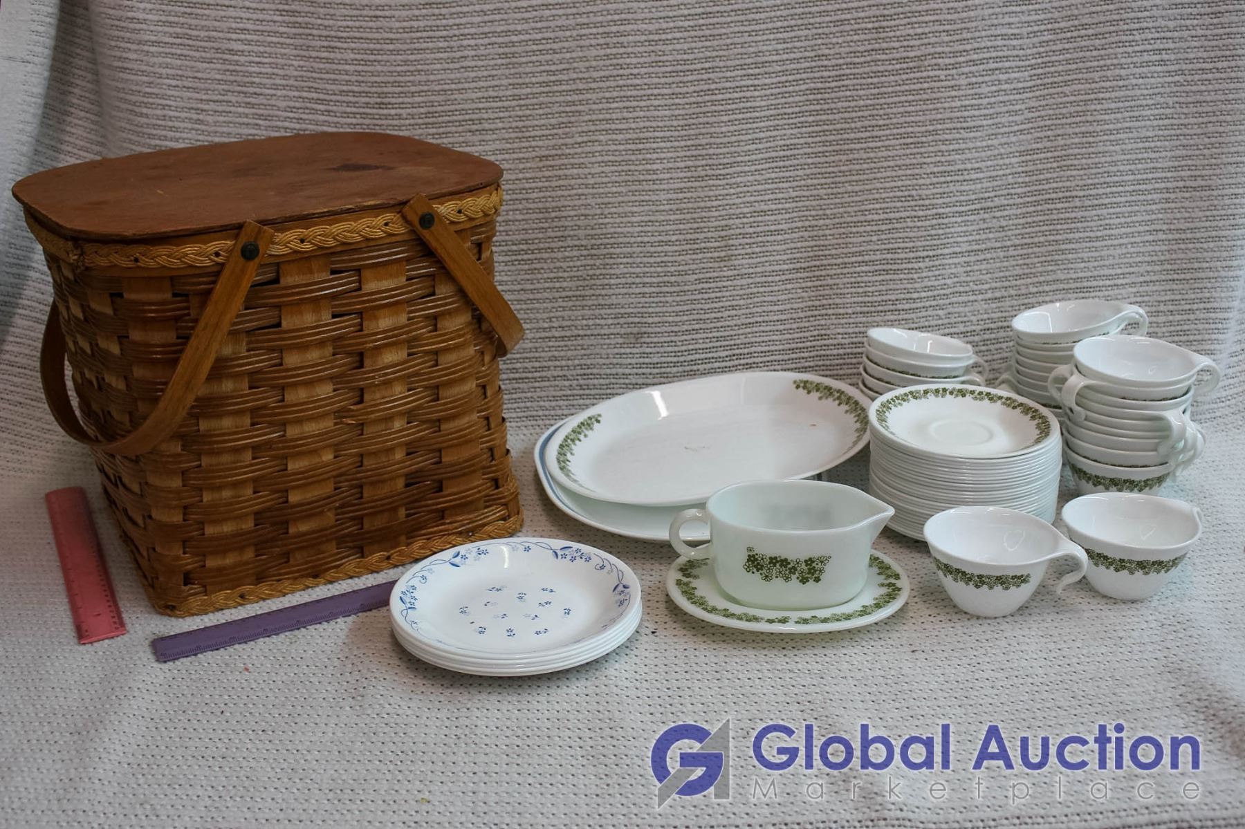 Lot of Dishware and Picnic Basket (25 ish Cups w/ Matching Saucers)