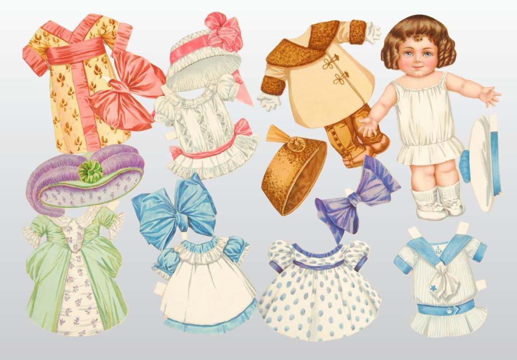 Description ND. From the Tuck "Dressing Dolls Series", this is a set of 9-inch dolls- "Alice", "Baby", "Dorothy", and "Caroline" are in near mint condition. The original mailing envelope is fragile and broken apart. A second paper doll, "Susan", is a 9-inch 'moving eye' doll. Her clothing is uncut and in very good condition.