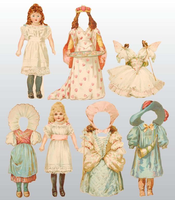 Description ND. 9.5-inch brunette Nursery Rhyme doll has six costumes and four hats/bonnets including Queen of Hearts, Little Boy Blue, and Red Riding Hood. The second lot, a 9.5-inch blonde doll, has six costumes/ headdresses of various countries including Spain, Japan, Holland, and England. Both dolls are in wonderful condition.