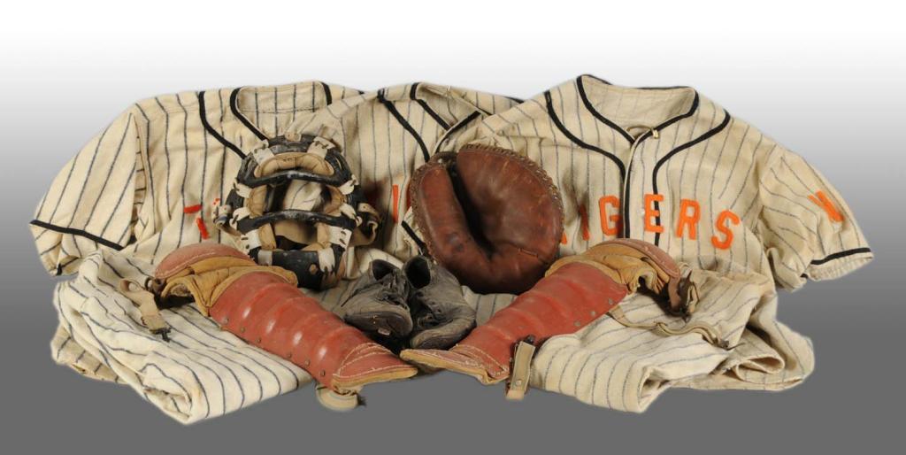 Includes one player's gear from either the minor leagues, Negro leagues or possibly minor-Negroes league. Consists of a pair of catchers shin guards, glove, two masks, pair of cleats, four pairs of flannel pants and three flannel shirts marked "Tigers" in orange lettering. Some staining, use and wear. Condition (Very Good).