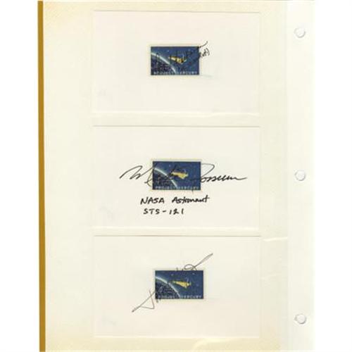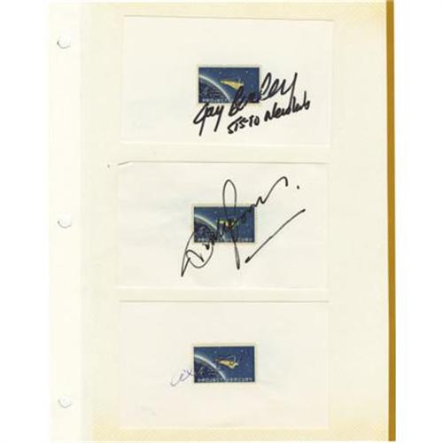 <B>Lot of Eight Astronaut Signatures,</B></I> including: Robert S. Buchanan, Mike Fossum, John Herrington, Jay Buckley, Paul Scully-Power, Al Atwell, and John-David Bartoe. Each signature is on or near a space related stamp mounted on a 5" x 3" card. Bartoe also signed an official NASA photograph. All cards and photos are in acetate album pages. All are very fine. <B></B></I><BR><BR><b>Shipping:</b> Flat Material, Small (<a target="_blank" href="http://www.heritageauctions.com/common/shipping.php">view shipping information</a>)