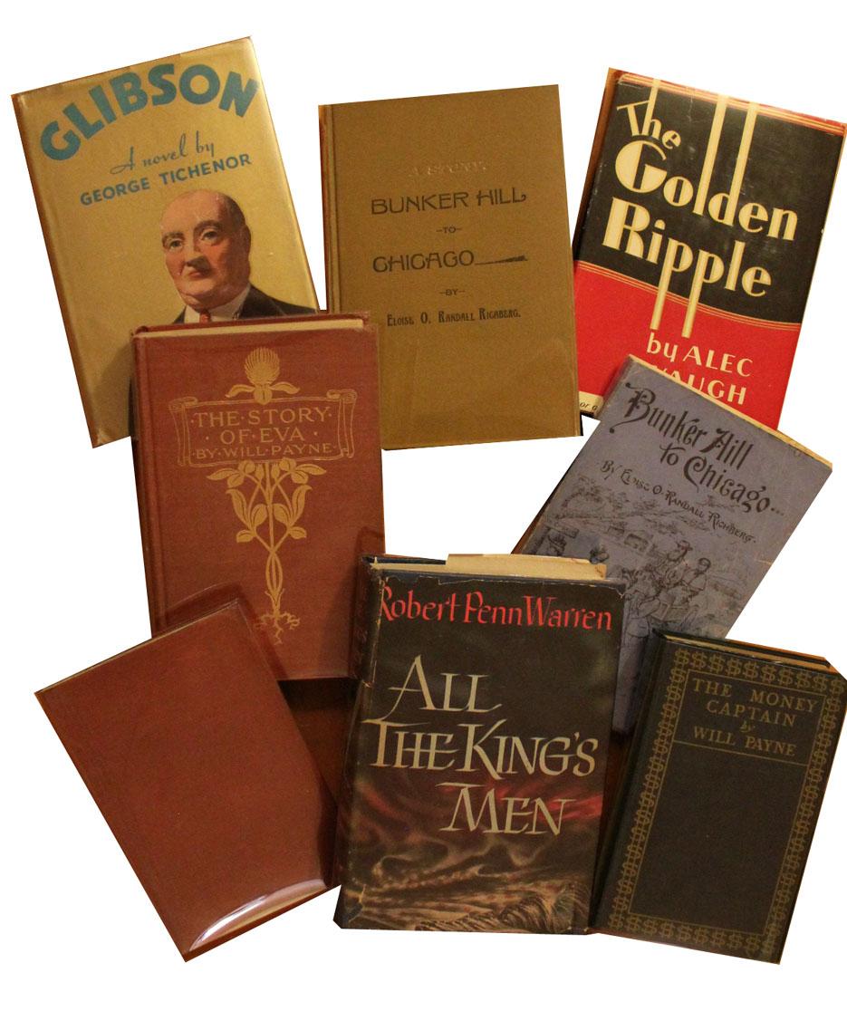 Lot of eight rare financial books from the turn of the 19th century: (1) ''Stories of Banks and Bankers'' by Frederick Martin. Hardcover first edition, first printing. Macmillan and Co: London: 1865. With German university library stamp in purple ink on title page and contents page. Original maroon cloth boards have some wear to edges. (2) ''The Money Captain'' by William Payne. Hardcover first edition, first printing. Herbert S. Stone & Company: Chicago: 1898. Original blue cloth boards, with previous owner's bookplate on front pastedown. (3) ''The Story of Eva'' by Will Payne. Houghton, Mifflin & Company: New York: 1901. Hardcover first edition, first printing copy. With previous owner's inscription on front free endpaper. (4) ''Bunker Hill to Chicago'' by Eloise. O. Randall Richberg. Dibble Publishing Co.: Chicago: 1893. Paperback first edition, first printing bound in blue wraps with some wear to the spine and panels. (5) ''Bunker Hill to Chicago'' by Eloise. O. Randall Richberg. Dibble Publishing Co.: Chicago: 1893. With inscription on title page by Richberg reading: ''With a Merry Christmas to Miss Ida Mason from the author - Dec. '99''. Minor wear to beige cloth board edges. (6) ''Glibson'' by George Tichenor. Hardcover first edition, first printing. Original dustjacket with unclipped $2.50 price intact. Farrar & Rinehart: New York: 1933. (7) ''All the King's Men'' by Robert Penn Warren. Harcourt, Brace and Company: New York: 1946. First edition, second printing hardcover in original dustjacket. With previous owner's signature on front pastedown. (8) ''The Golden Ripple'' by Alec Waugh. Hardcover first edition, first printing. Farrar & Rinehart: New York: 1933. Original dustjacket intact, with minor chips and tears to edges.