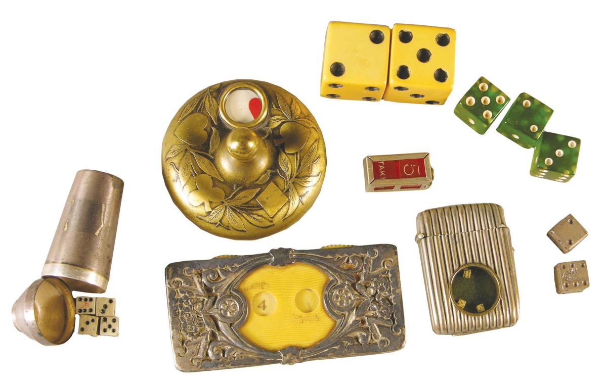 Lot of Eight Misc. Gambling items including a scorekeeper, match safe with dice and trumps indicator.