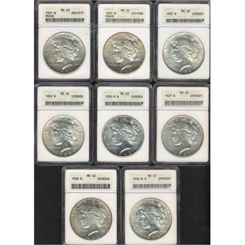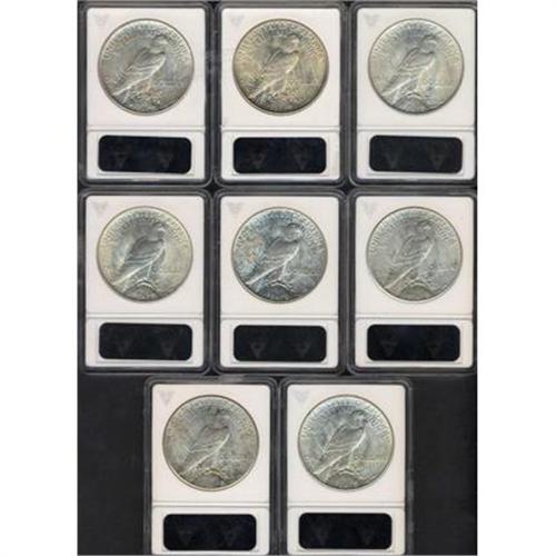 <b>Lot of Eight Peace Dollars.</b> Includes: 1921 ANACS MS63 (x2), 1922 ANACS MS63, 1924 ANACS MS64, 1926-S ANACS MS63, 1927 ANACS MS63, 1928 ANACS MS62, and 1934-D ANACS MS61. Lot of 8 coins.