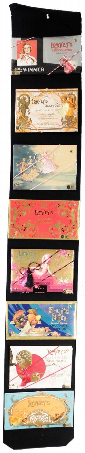 Lot of Eight Sample Lowney's Chocolate Box Lids. The Walter M. Lowney Co. Boston, Mass. All priced at 60 cents. Some have original silk tassels and are mounted on felt for display. All in near mint condition. Each measures 9 X 5 inches.