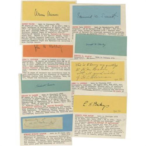 <B>Lot of Eight Signatures of Scientific Interest,</B></I> including: <B>Warren Weaver</B></I> (1894-1978) was an American scientist, mathematician, and science administrator; <B>Herbert S. Gasser</B></I> (1888 -1963) was an American physiologist, and recipient of the Nobel Prize for Physiology or Medicine in 1944 for his work with action potentials in nerve fibers; <B>John H. Northrop</B></I> (1891-1987) was an American biochemist who won the Nobel Prize in Chemistry in 1946 (with James Batcheller Sumner and Wendell Meredith Stanley) for purifying and crystallizing certain enzymes; <B>Wendell M. Stanley</B></I> (1904-1971) was an American biochemist, virologist and Nobel prize laureate; <B>Henry C. Sherman</B></I> (1875-?) was president of the American Institute of Nutrition; <B>Edmond W. Sinnott</B></I> ( 1888-1968) an American scientist whose work in plant genetics and morphology, specifically, how genetics variously controlled the relationships between cells and organs in different species of plants; <B>Stephen M. Babcock</B></I> (1843-1931) was an American agricultural chemist. He is best known for his Babcock test in determining dairy butterfat in milk processing, in cheese processing, and in the "single-grain experiment" that would lead to the development of nutrition as a science; <B>Liberty Hyde Bailey</B></I> (1858-1954) was an American horticulturist, botanist and cofounder of the American Society for Horticultural Science. All very fine. <BR><BR><b>Shipping:</b> Flat Material, Small (<a target="_blank" href="http://www.heritageauctions.com/common/shipping.php">view shipping information</a>)