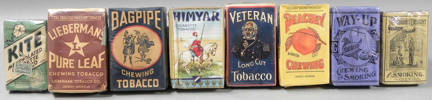Lot of Eight Tobacco Packs including Himyar, Vetran, Bagpipe, Peachey, Lieberman's, Way-Up, Mechanic's Delight and Kite Mentholated. All in very good to excellent condition. Pack sizes vary. Start Price $50