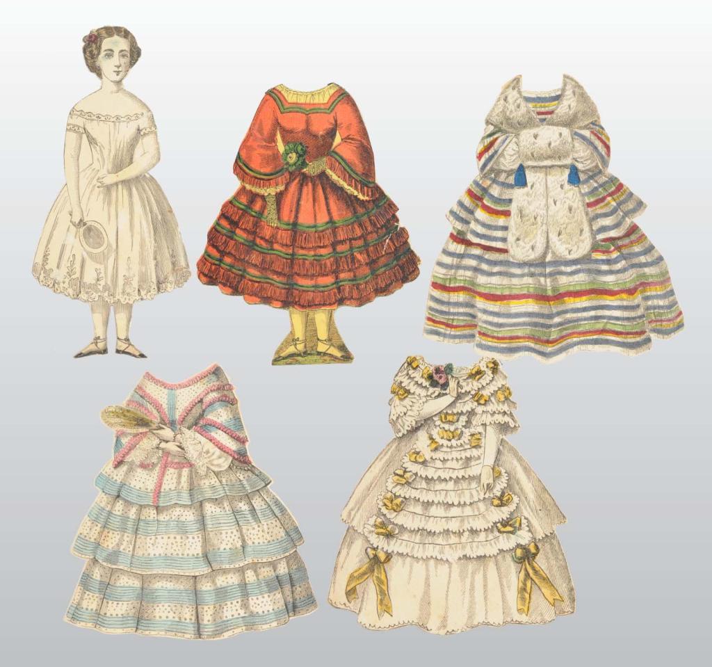Description ND. Published by Clark, Austin, Smith as part of the "Girl's Delight" Series, "Ella", a 4.5-inch doll has two outfits. "Clara," part of the same series is a 6-inch doll with five outfits and two reproduction hats. Her head was repaired. Both dolls are in very good condition.