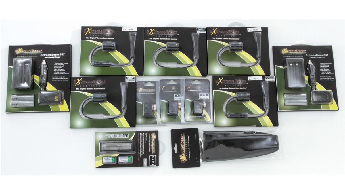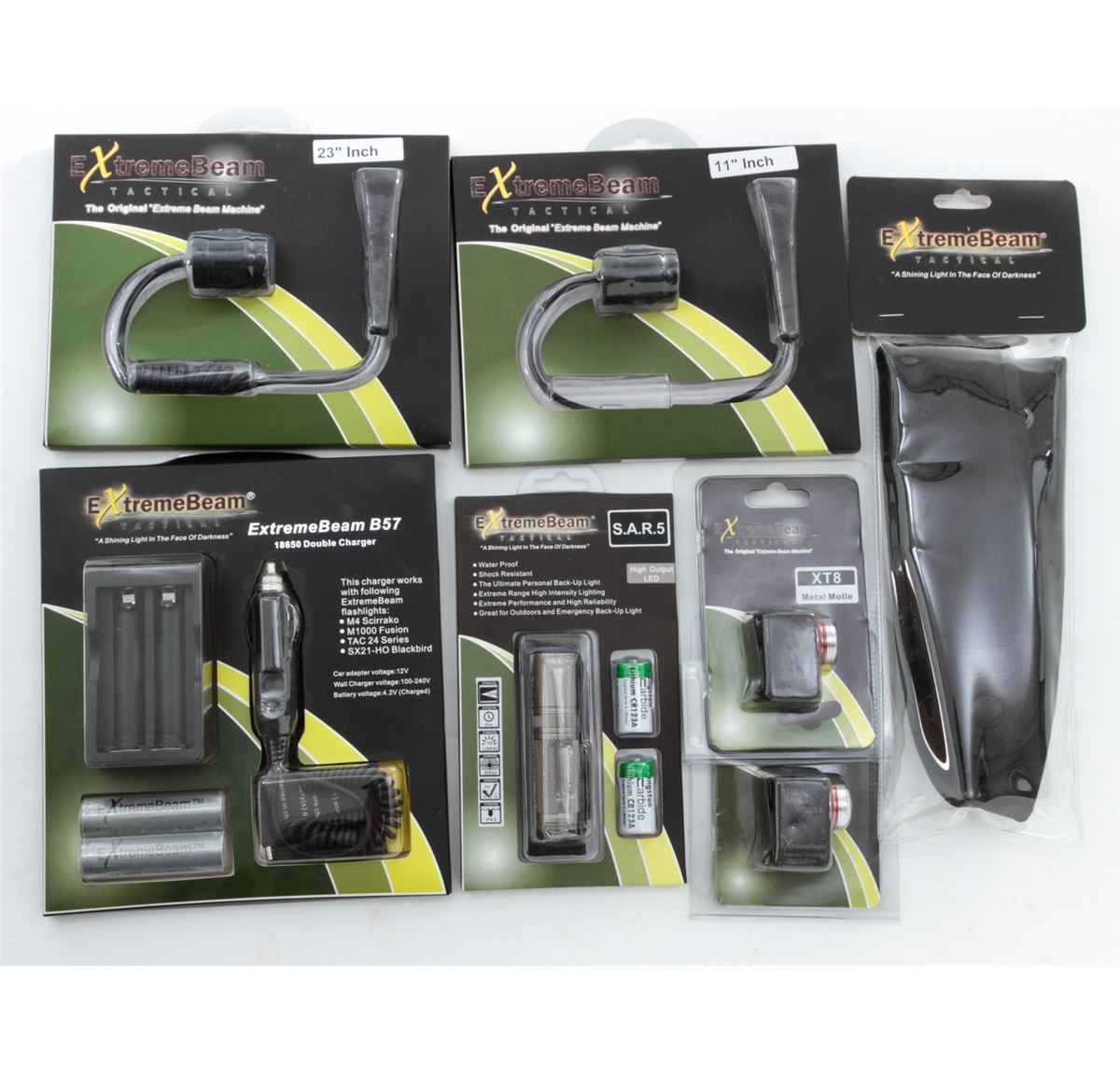 Dealer's Lot of ExtremeBeam Tactical Accessories, including five (5) remote switches, 11'' and 23''; two (2) B57 Double Chargers for car/wall; three (3) metal molles; S.A.R.5 LED high-output flashlight with lithium batteries; and a M1000 fusion holster. Twelve (12) pieces, all brand new in their original packaging. Retails @ over $400/lot. Est.: $250-$350/lot. (Field Time)