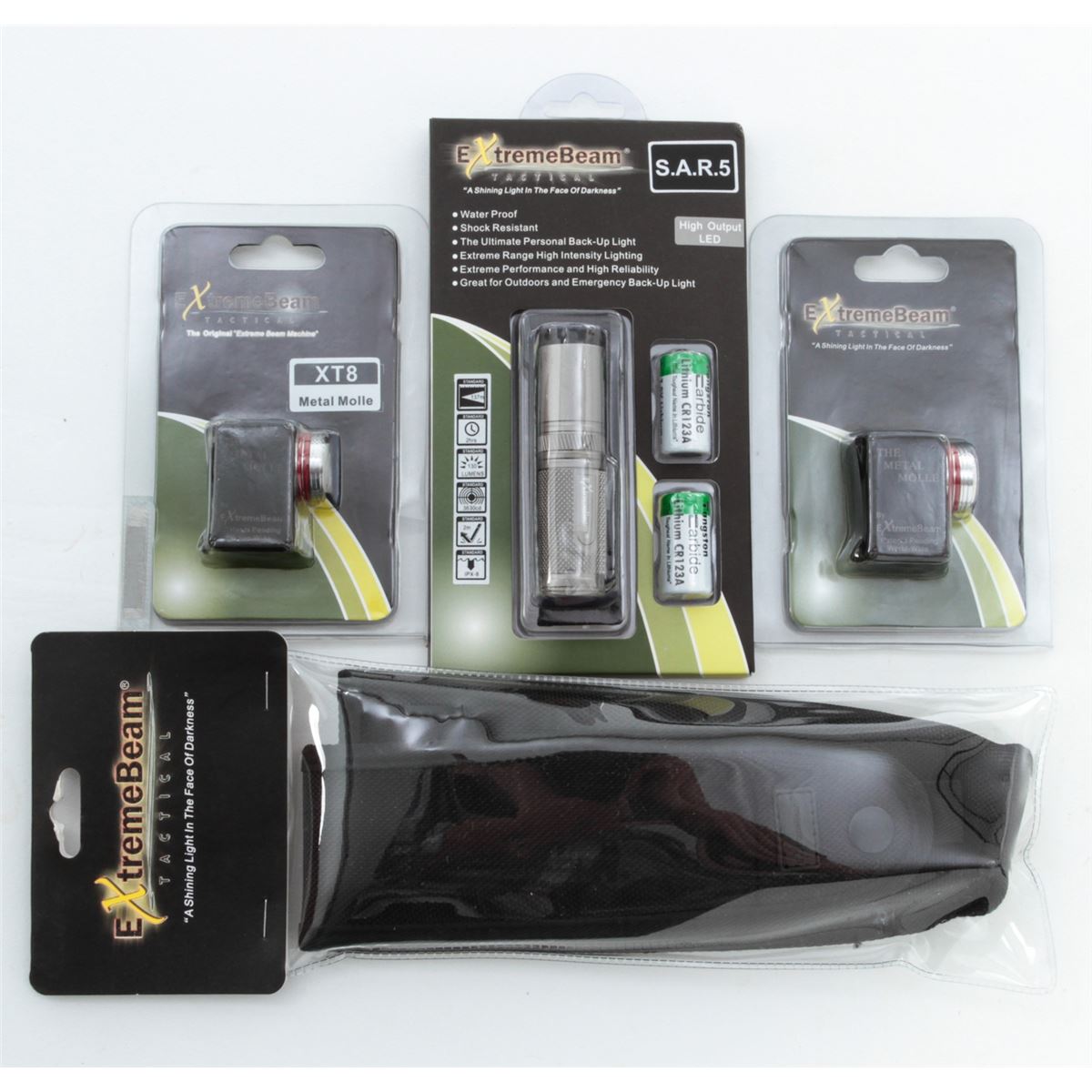 Dealer's Lot of ExtremeBeam Tactical Accessories, including five (5) Remote Switches; B57 Double Charger for car/wall; three (3) metal molles; S.A.R.5 LED high-output flashlight with lithium batteries; and a M1000 fusion holster. Eleven (11) pieces, all brand new in their original packaging. Retails @ $375/lot. Est.: $200-$300/lot. (Field Time)