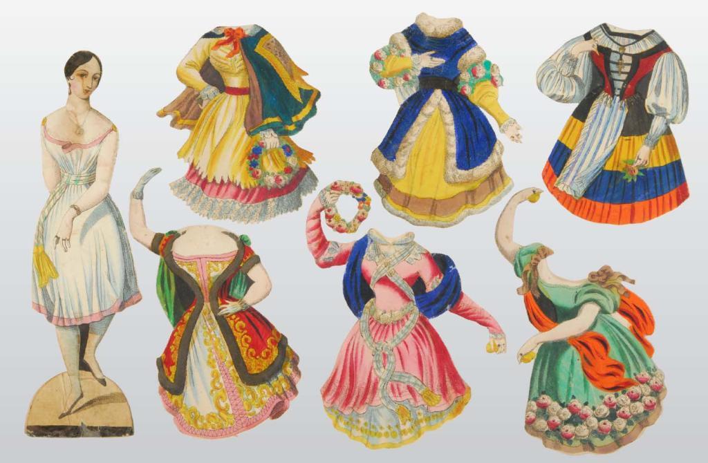 Description Circa 1830s-1840s. A 9-inch front/ back doll in fair condition with stains, rust bleed on reverse, soil and paper chips. Fanny has six front/ back, hand colored costumes in excellent condition.