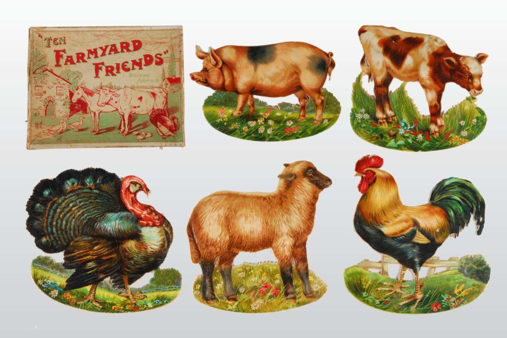 Description ND. Manufactured by the Gabriel Company and printed in Germany, these beautifully embossed rockers range in height from 4 to 6 inches and are in excellent condition. The color is strong and each animal has a stand-up rocker piece marked with the Gabriel "G". The animals have minor wear. The box is soiled, in poor condition with missing pieces, and the sides sewn in place.
