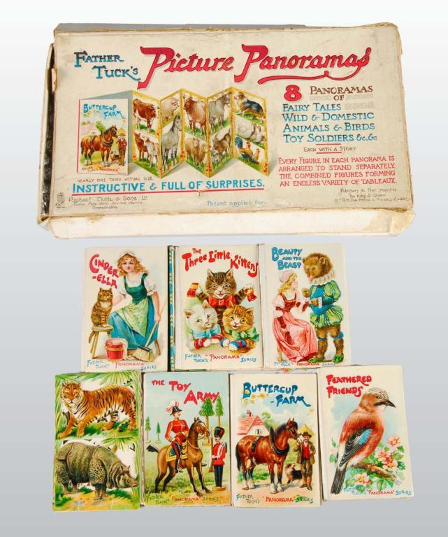 Description ND. The die cut booklets include "Three Little Kittens" and a partially cut "Beauty and the Beast". "Cinderella" has only one die cut, and the cover of five panels of a wild animal set is missing. These books are fragile and some characters are separating from the panels. The box is in poor condition with missing sides.