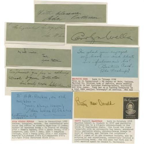 <B>Lot of Female Author Signatures</B></I> on card, about 5.5 x 2.5, mounted on stiff paper stock with typed biographical sketches. Includes signatures of <B>Betty MacDonald,</B></I> <B>Nina Wilcox Putnam,</B></I> <B>Beatrice Cook,</B></I> <B>Natalie Sumner Lincoln,</B></I> <B>Julia Peterkin,</B></I> <B>Carolyn Wells,</B></I> <B>Ada Patterson,</B></I> and <B>Ida M. Evans.</B></I> Fine. <BR><BR><b>Shipping:</b> Flat Material, Small (<a target="_blank" href="http://www.heritageauctions.com/common/shipping.php">view shipping information</a>)