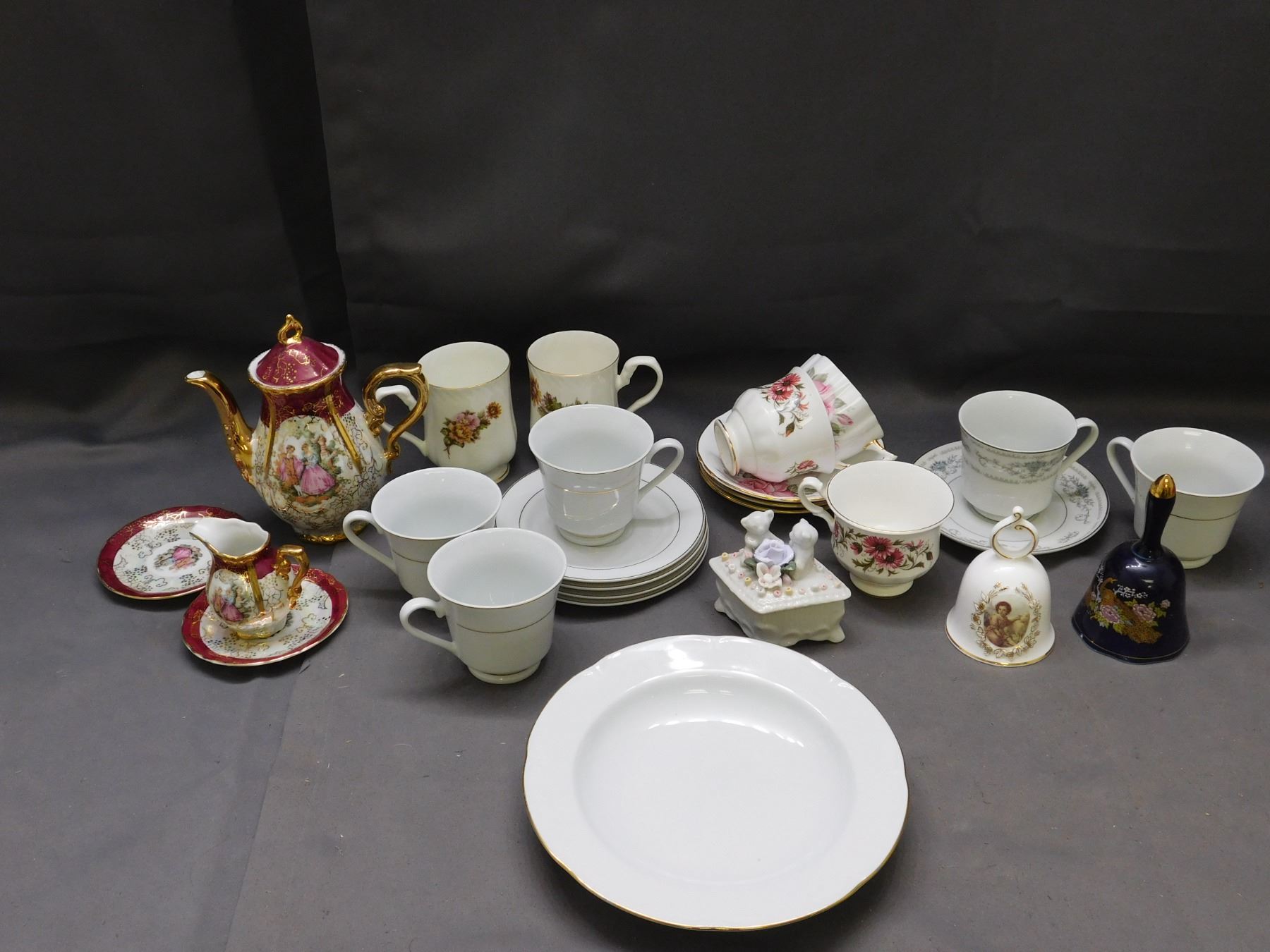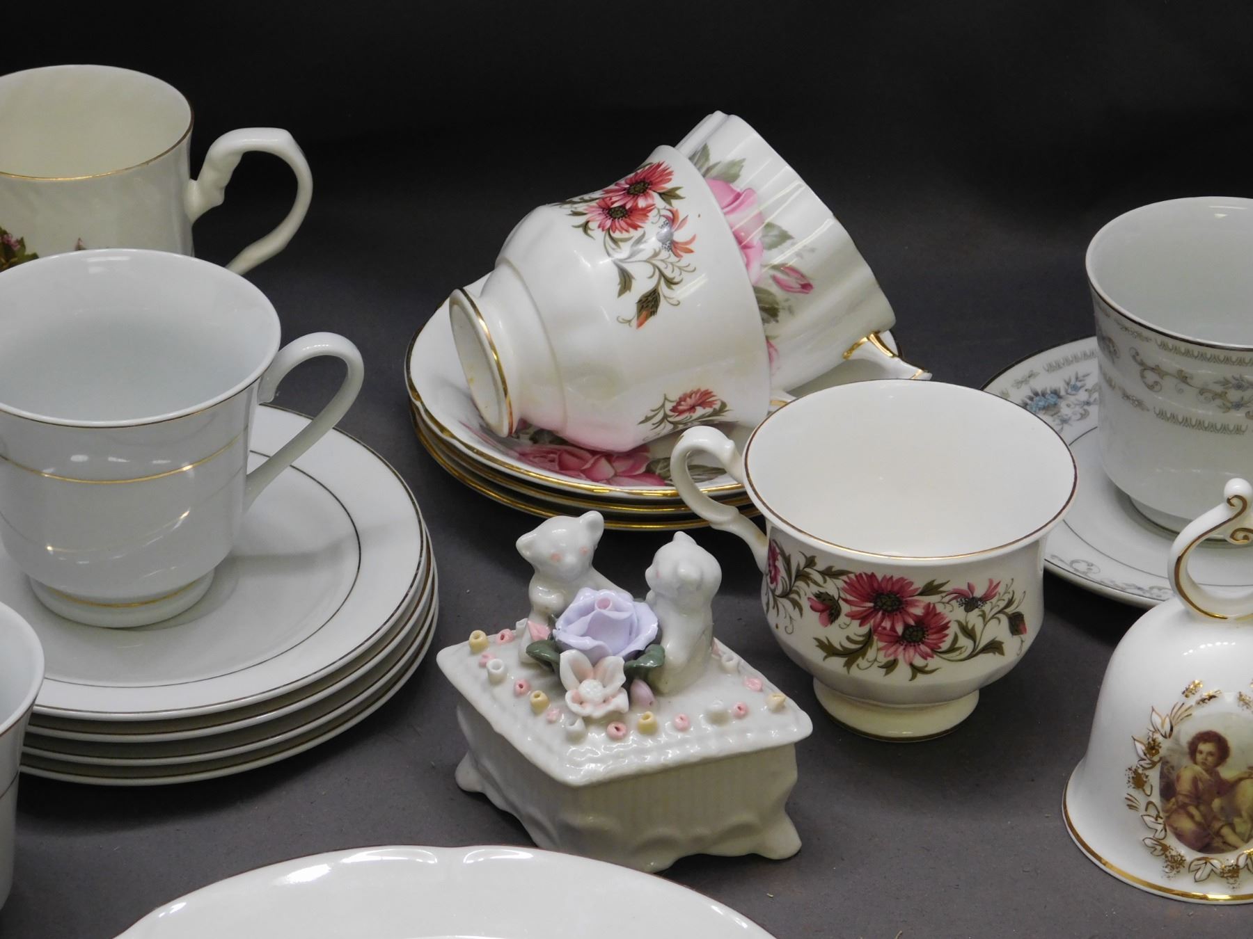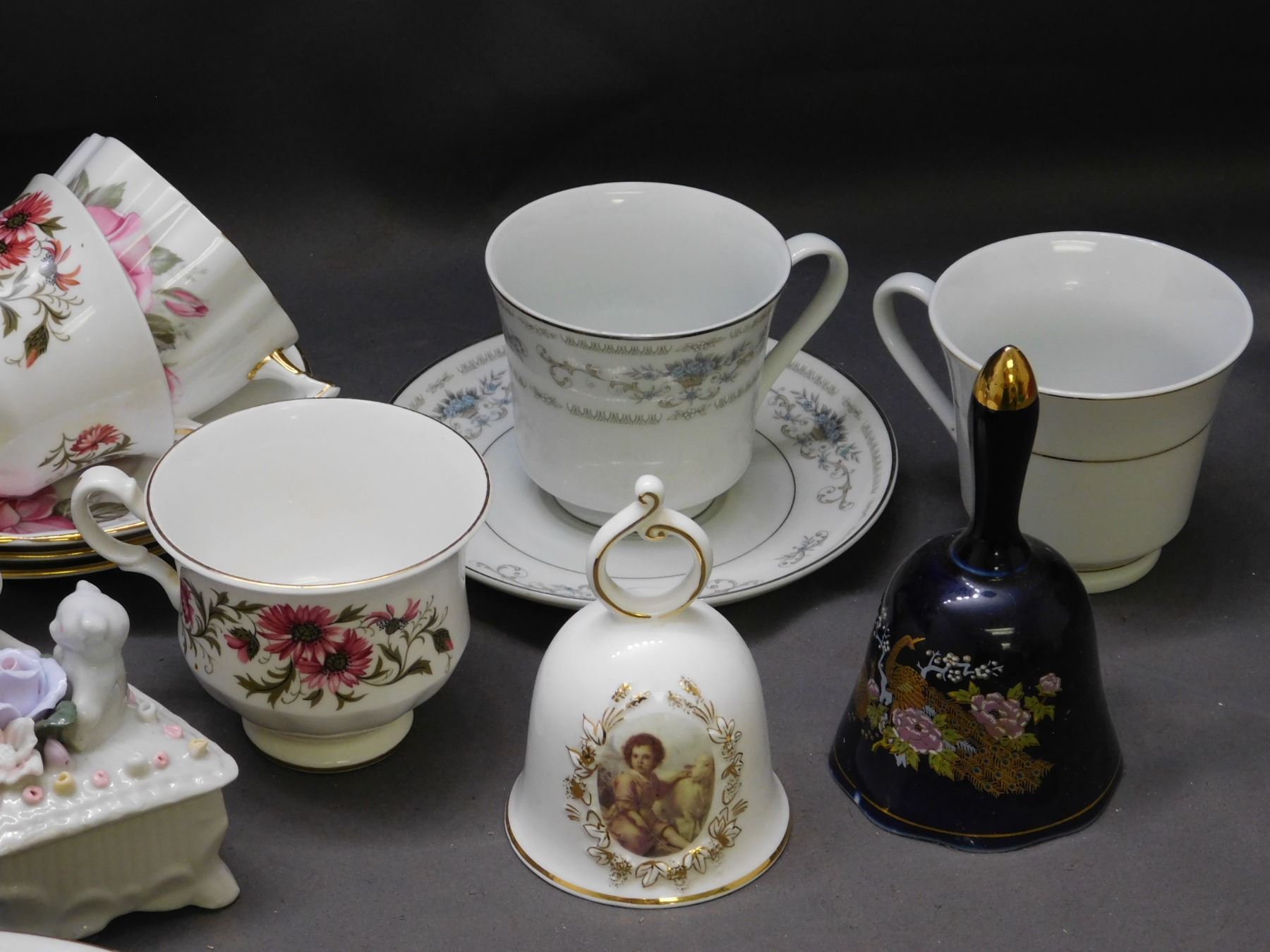 Lot of Fine Bone China Porcelain Tea Cups, Saucers, Bells, Plates, Pot, Trinket Box
