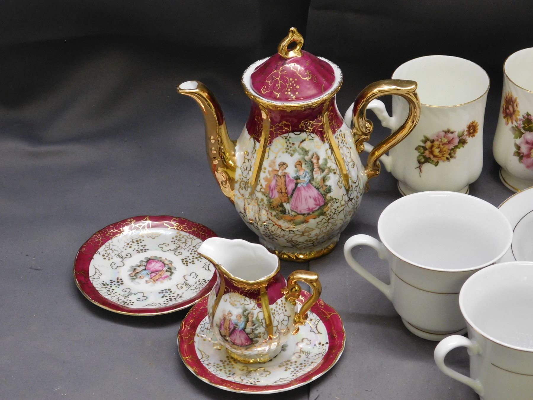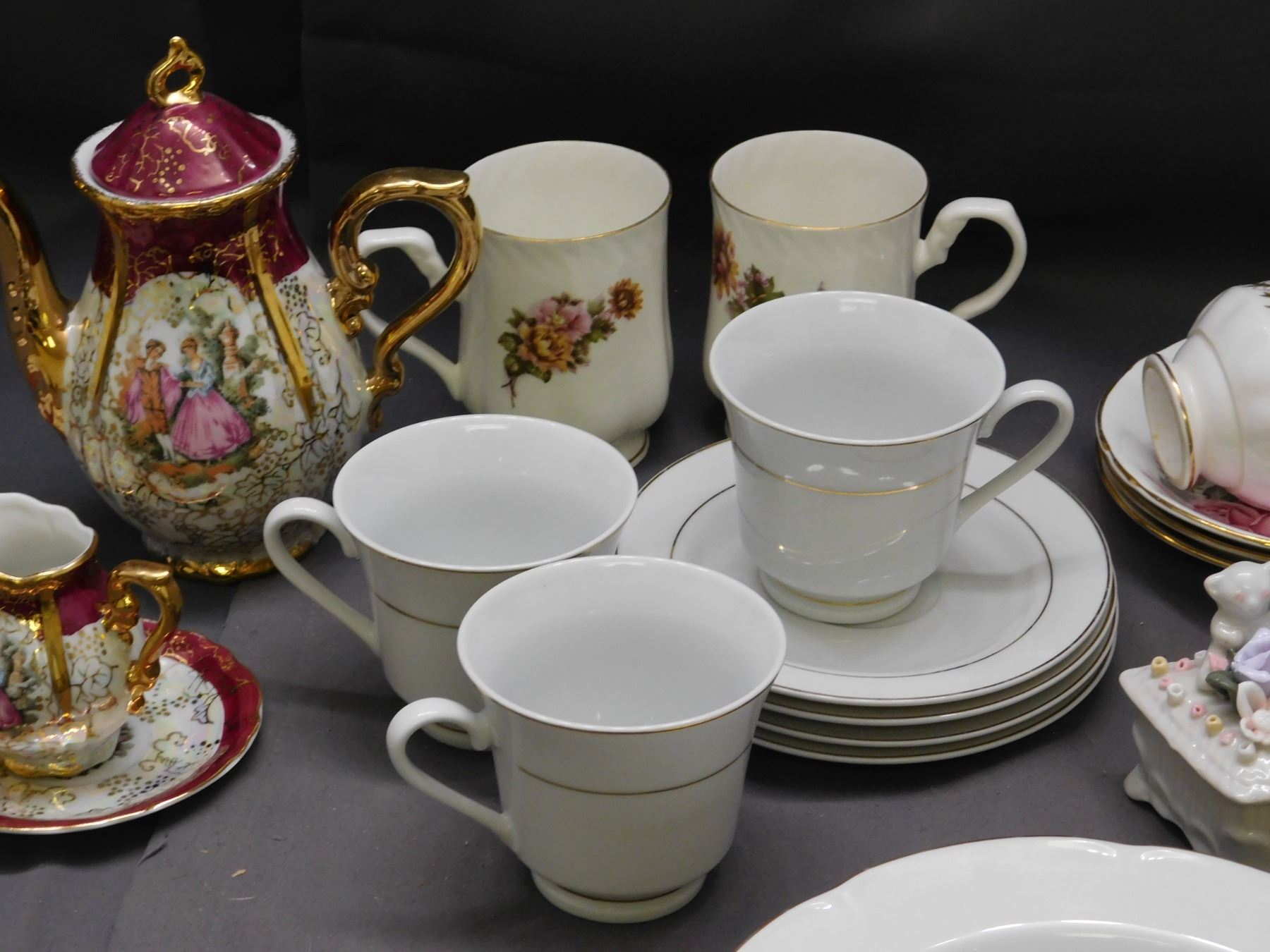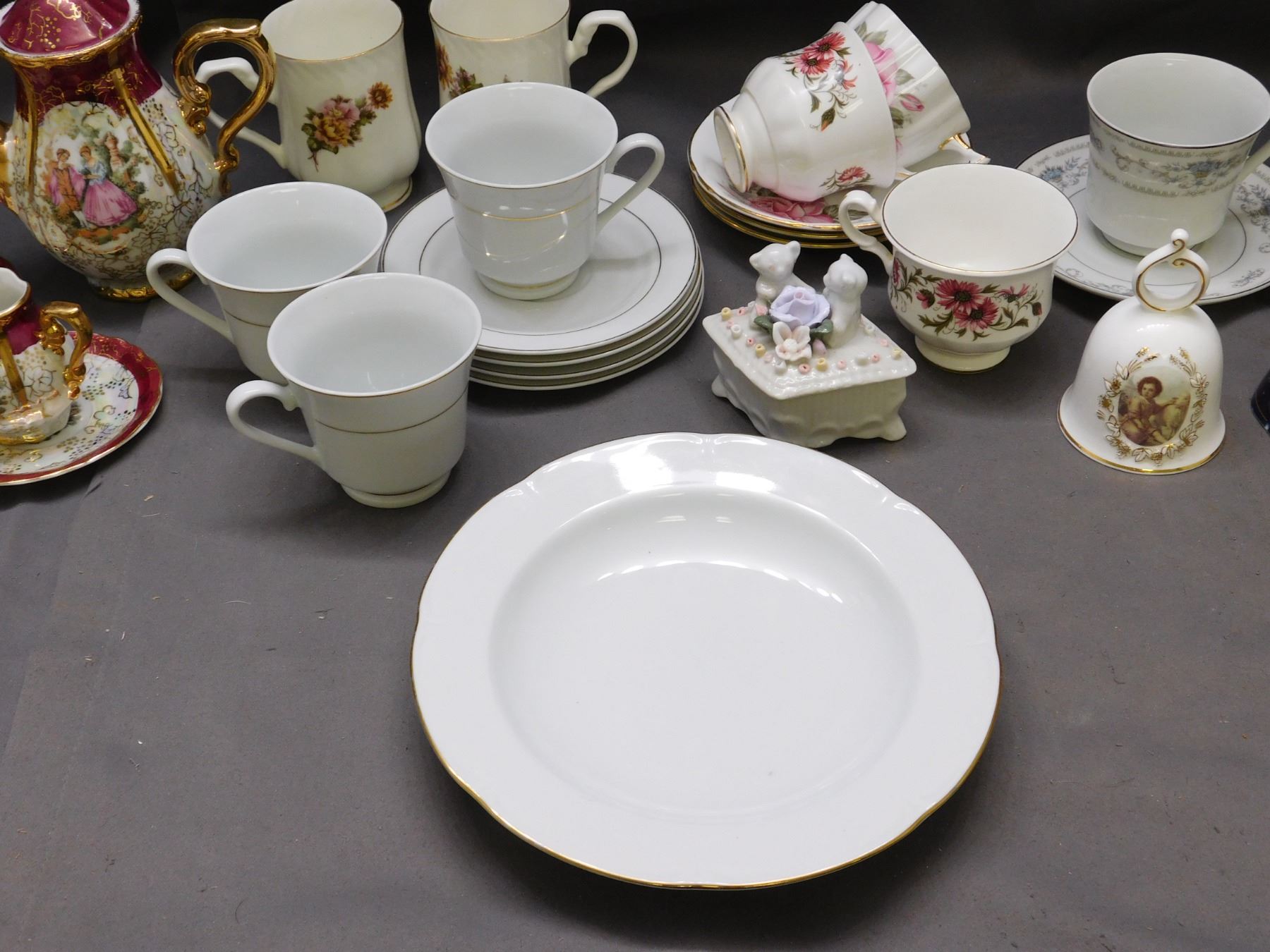 Lot of Fine Bone China Porcelain Tea Cups, Saucers, Bells, Plates, Pot, Trinket Box