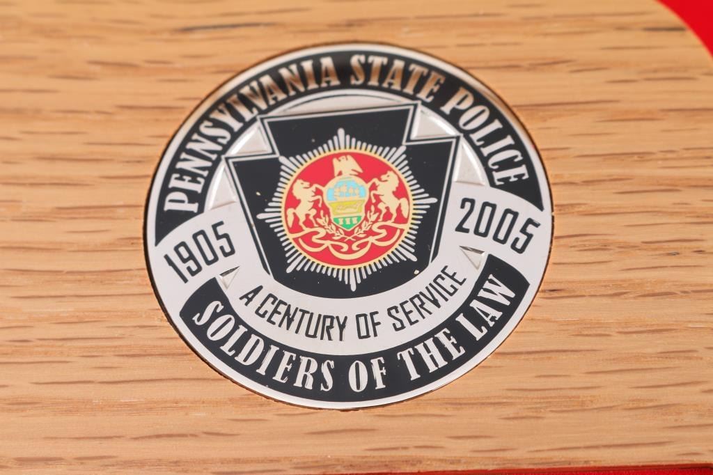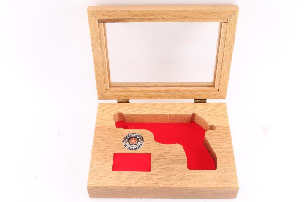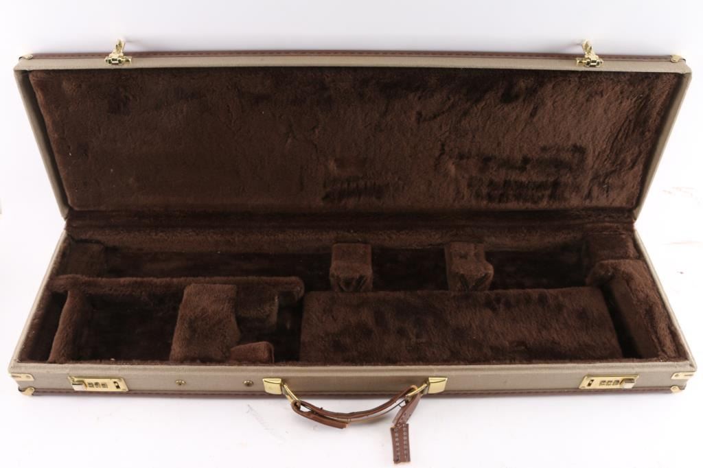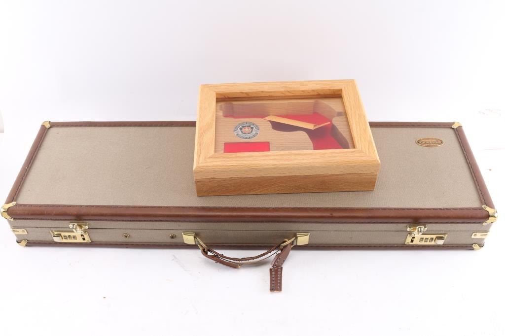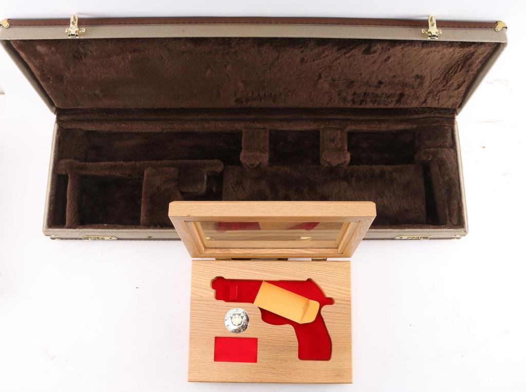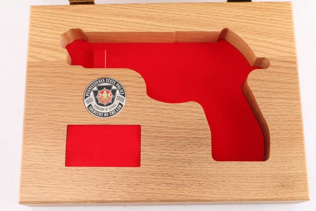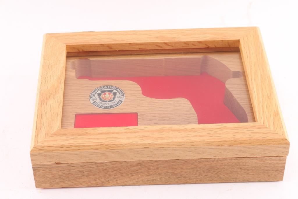(1) Pennsylvania State Police display case with red felt. Cutout is for a Beretta 92. PSP name plate. (1) Browning fitted side by side shotgun case, dark brown felt lining, in very good condition except for handle.