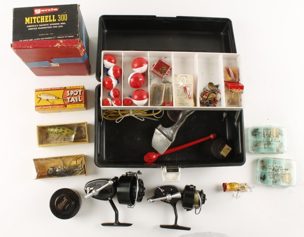 One Mitchell Garcia 300 in box with extra spool. One Mitchell Garcia 308 with extra spool. Tackle box with spinners, spoons, plugs, bobbers weights swivels, etc.