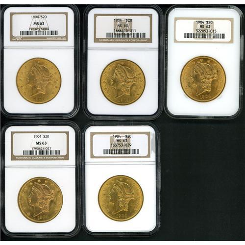 Includes: Five 1904 NGC MS63. Lot of 5 coins.