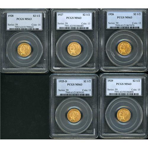Includes: 1925 D PCGS MS63, 1926 PCGS MS63, 1927 PCGS MS63, 1928 PCGS MS63, 1929 PCGS MS63. Lot of 5 coins.