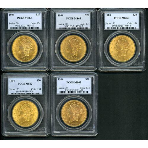 Includes: Five 1904 PCGS MS63. Lot of 5 coins.