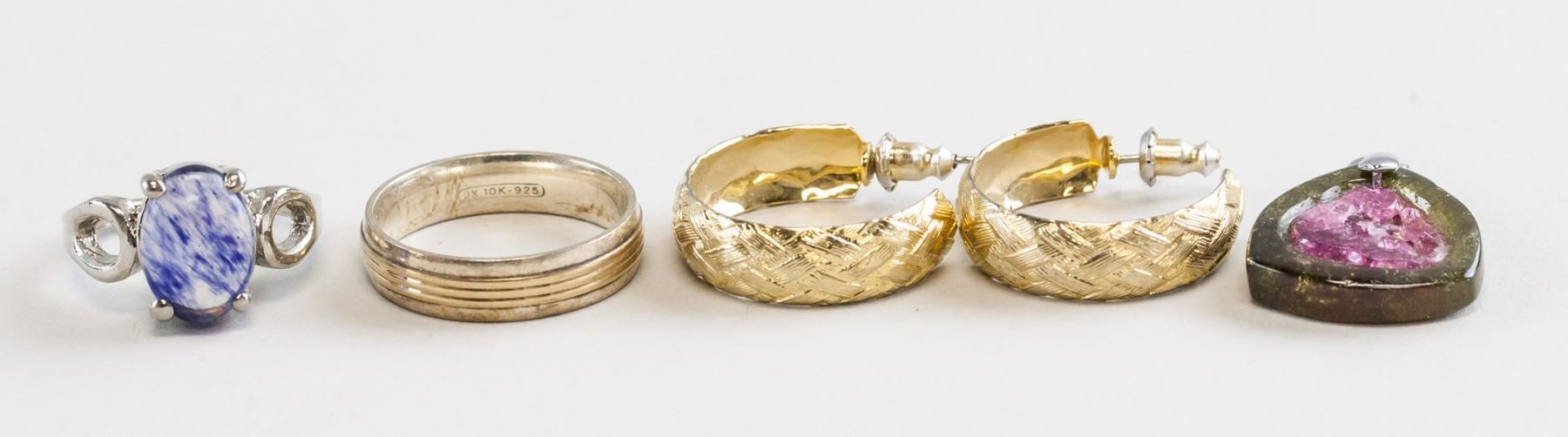 Assorted rings, earrings, and pendants. "JX 10K-925" stamped inside one ring. Ring size: 9.5. 249 grams total.