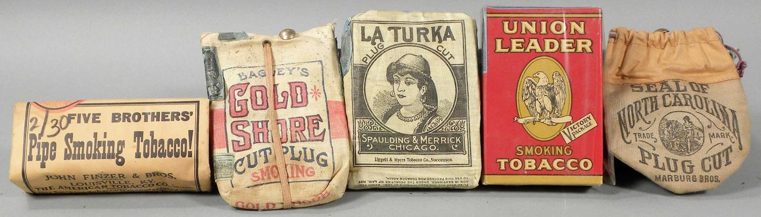 Lot of Five Assorted Tobacco Packs/Pouches including Union Leader, Seal of North Carolina, Gold Shore, Five Brothers' and La Turka. Gold Shore in good, all others in excellent condition. Pack sizes vary. Start Price $40