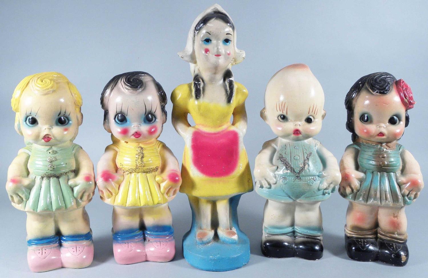 Lot of Five "Baby" Carnival Chalk Figures and one "Dutch Girl". All in excellent condition. They measure 12/16 inches.