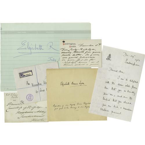<B>Lot of Five British Royalty Documents Signed</B></I> including: "<I>Edward, Duke of Windsor</B></I>" and "<I>Wallis, Duchess of Windsor</B></I>" signed on a sheet bearing the cipher of the Duke and Duchess of Windsor under the coronet of a royal duke, 5.5" x 3.5", with an unsigned cover letter December 1956, Paris; an autograph letter signed "<I>Elizabeth R</B></I>", the queen mother, two pages (front and verso) on note paper bearing her crowned cipher, 5" x 8", December 29, 1963, Sandringham, with envelope; a page from a guest book signed "<I>Elizabeth R, July 1, 1979</B></I>", the queen mother, 10.5" x 8"; a sheet signed "<I>Elizabeth Bowes Lyon</B></I>", the queen mother prior to her marriage to the Duke of York (King George VI), 7" x 6"; autograph Sandringham note card signed "<I>Albert Edward</B></I>" as Prince of Wales, two pages (front and verso), 4.75" x 3.25", December 5, 1895 , with envelope bearing a red wax stamp with the Order of the Garter. All in very fine condition.<BR><BR><b>Shipping:</b> Flat Material, Small (<a target="_blank" href="http://www.heritageauctions.com/common/shipping.php">view shipping information</a>)