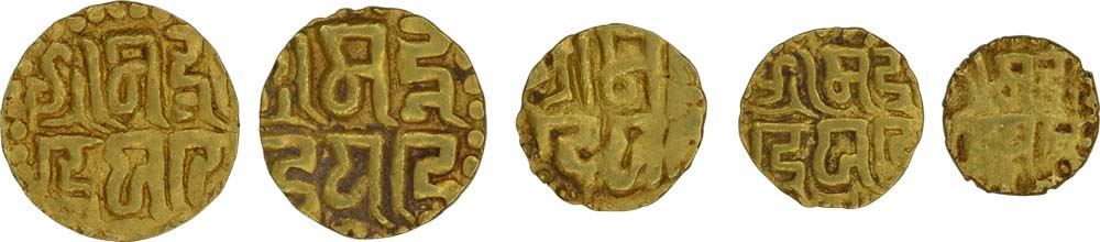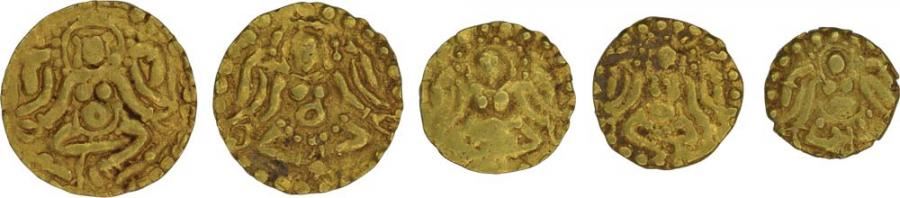 Kalachuris of Tripuri, Gangeya Deva(1015-1040 AD),Gold 4 ½Masha (5),Obv:seated lakshmicross-legged, the goddess is depicted four arms, holding lotus flowers in her upper arms,Rev:legend in three line in bold nagari letters"srimad/gangeya/devah",2.05g, 2.05g, 1.02g, 1.01g, 1.05g, 15.23mm, 14.62mm, 12.20mm, 11.66mm, 10.52mm, about extremely fine, Rare as a set.