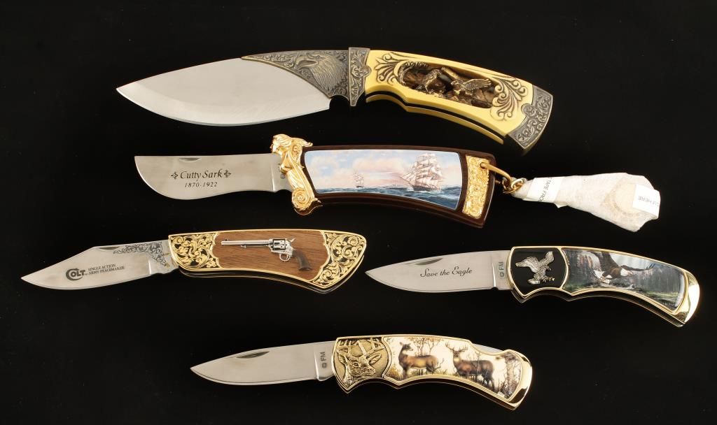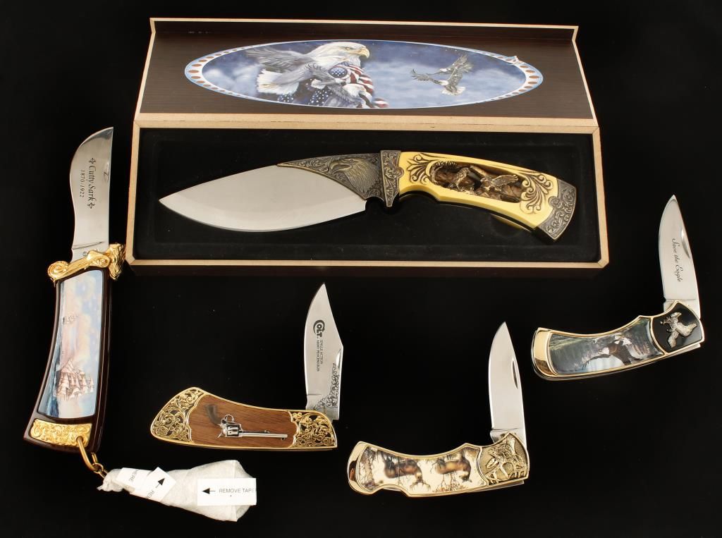 Four Franklin Mint Collector Knives (folding blade) in soft cases. One fixed blade decorative knife in wooden box.