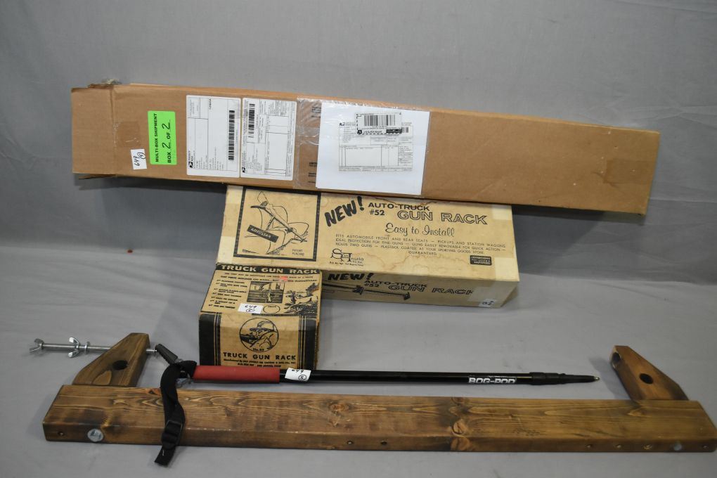 Lot of Five Items : New in Box Auto Truck # 52 Gun Rack - "Bog Pod" Shooting Rest - Truck Gun Rack in box - Two Brownell's Wooden Racks [ one put together, one in box ]