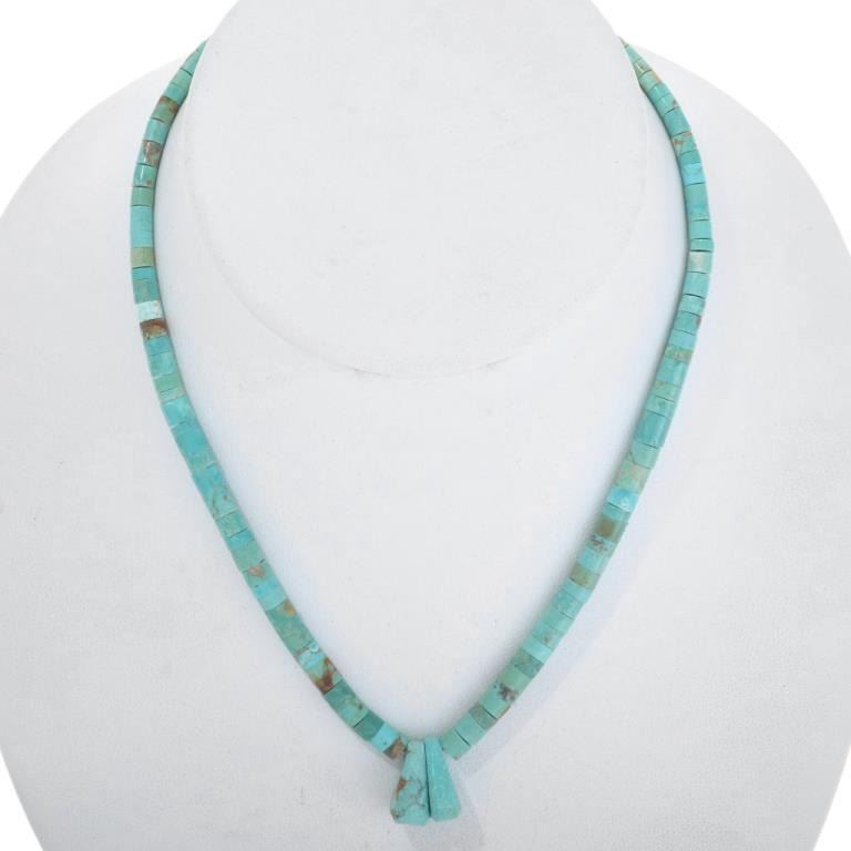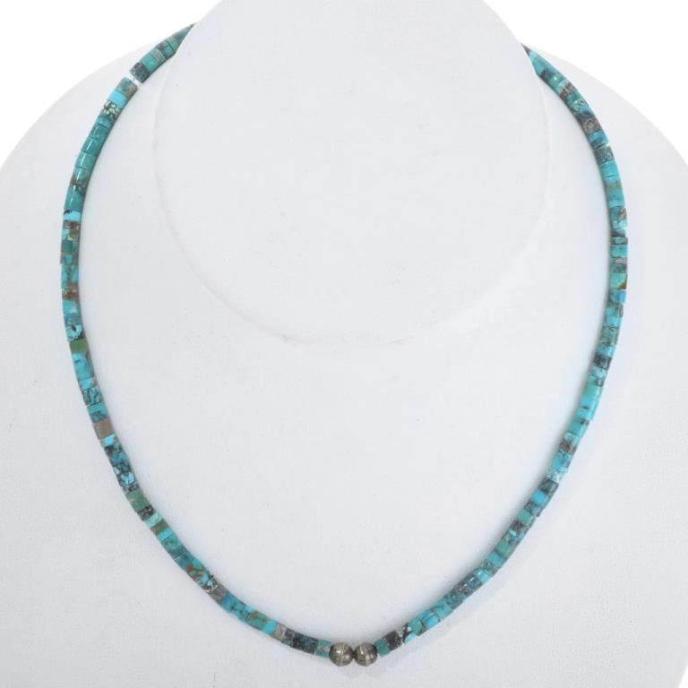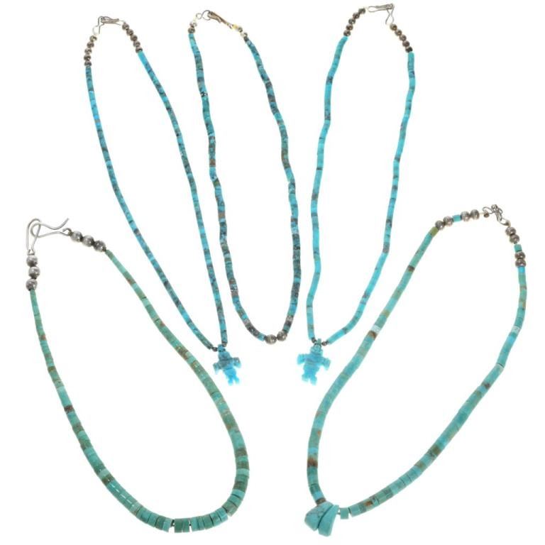 Lot of Native American, genuine Turquoise heishi necklaces/chokers with/without Sterling Silver beads. Two with thunderbird fetish. Longest is 16”, shortest is 14-3/4”.
