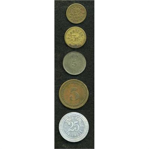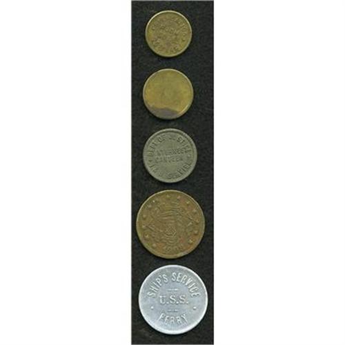 <B>Lot of Five Military Tokens.</B></I> Brass/aluminum. Includes military tokens: <B>Canteen Ft. Douglas 5 cts, 1 ct in trade Co. E 25th Inf. (brass); </B></I><B><I>U.S.S. Perry</B></I></B></I><B> </B></I>post-World War I ship sunk in 1944, <B> ship service good for 25 cts in trade, aluminum;</B></I> <B>Post Exchange Brooklyn Marine Barracks New York 1908 good for 5, brass;</B></I> plus scarce World War II U.S. Dept of Justice <B>Immigration & Naturalization Service Internee Canteen fiber 5 cent token. </B></I>These were used at various locations across the United States.<BR><BR><b>Shipping:</b> Coins & Currency (<a target="_blank" href="http://www.heritageauctions.com/common/shipping.php">view shipping information</a>)