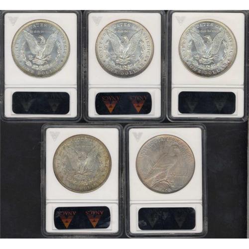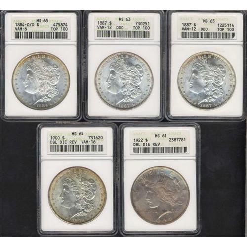 <b>Lot of Five Morgan Dollars.</b> Includes: 1884-O/O ANACS MS65 VAM-6 Top 100, 1887 ANACS MS63 VAM-12 DDO Top 100, 1887 ANACS MS65 VAM-12 DDO Top 100, 1900 ANACS MS65 DBL DIE REV VAM-16, and 1922 ANACS MS61 DBL DIE REV. Lot of 5 coins.