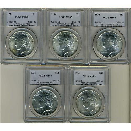 Lot includes: 5-1934 PCGS MS65. All bright and original. Lot of 5 coins.