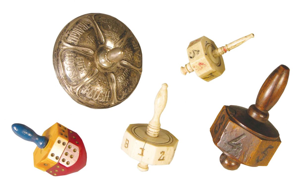Lot of Five Put-in-takes and gambling tops. Various sizes and conditions. Largest measures 3 inches tall.