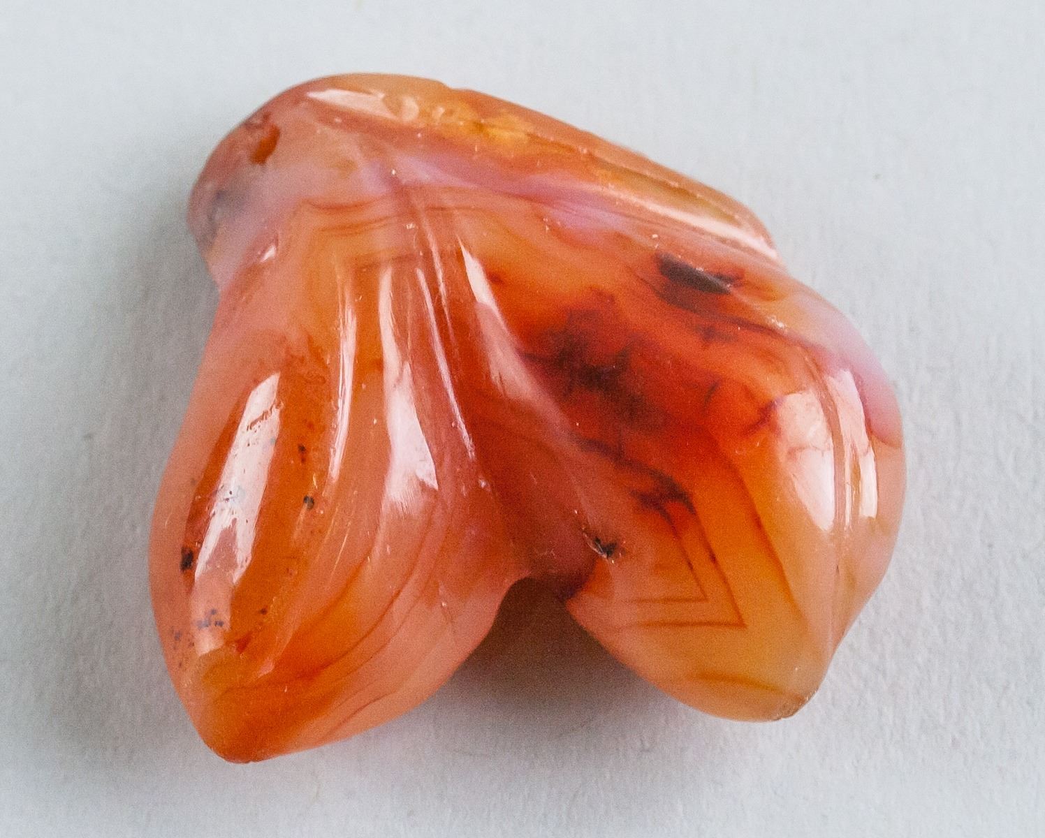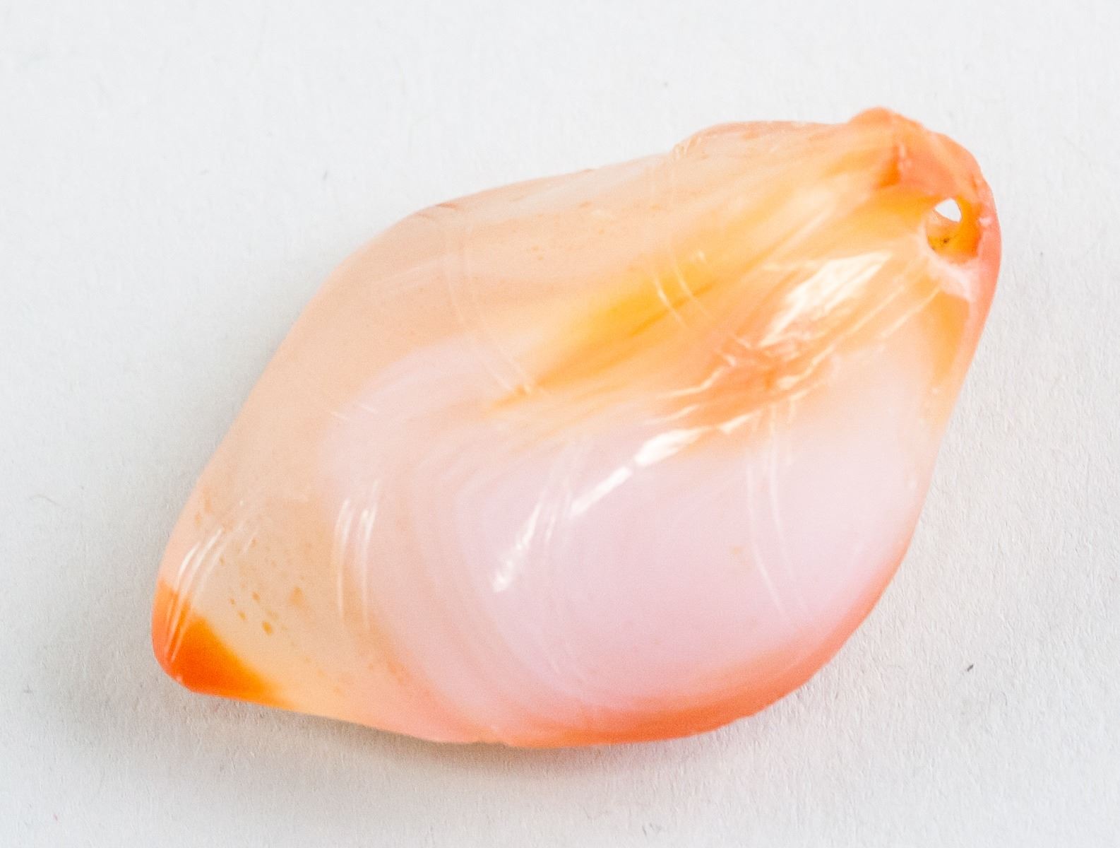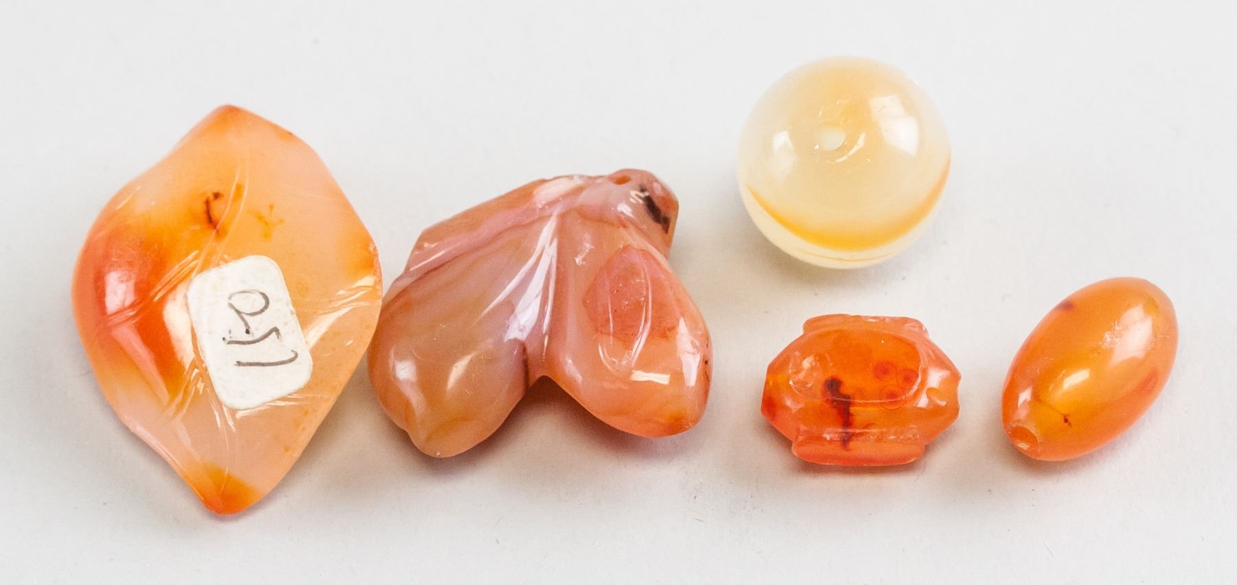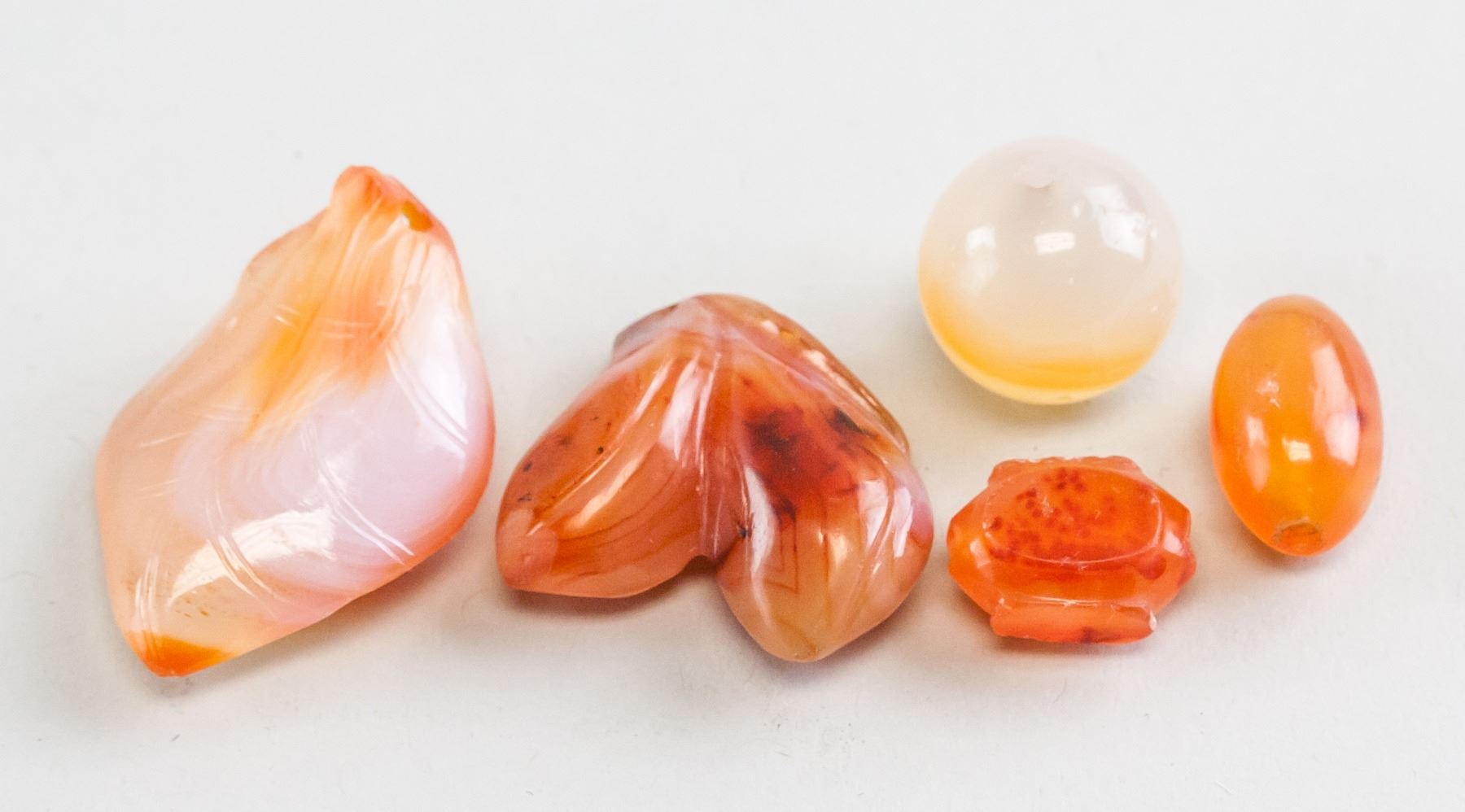 Lot of five (5) agate pendants. Of red and orange tone. Of various shapes. 4 x 3 cm, 45 grams total.