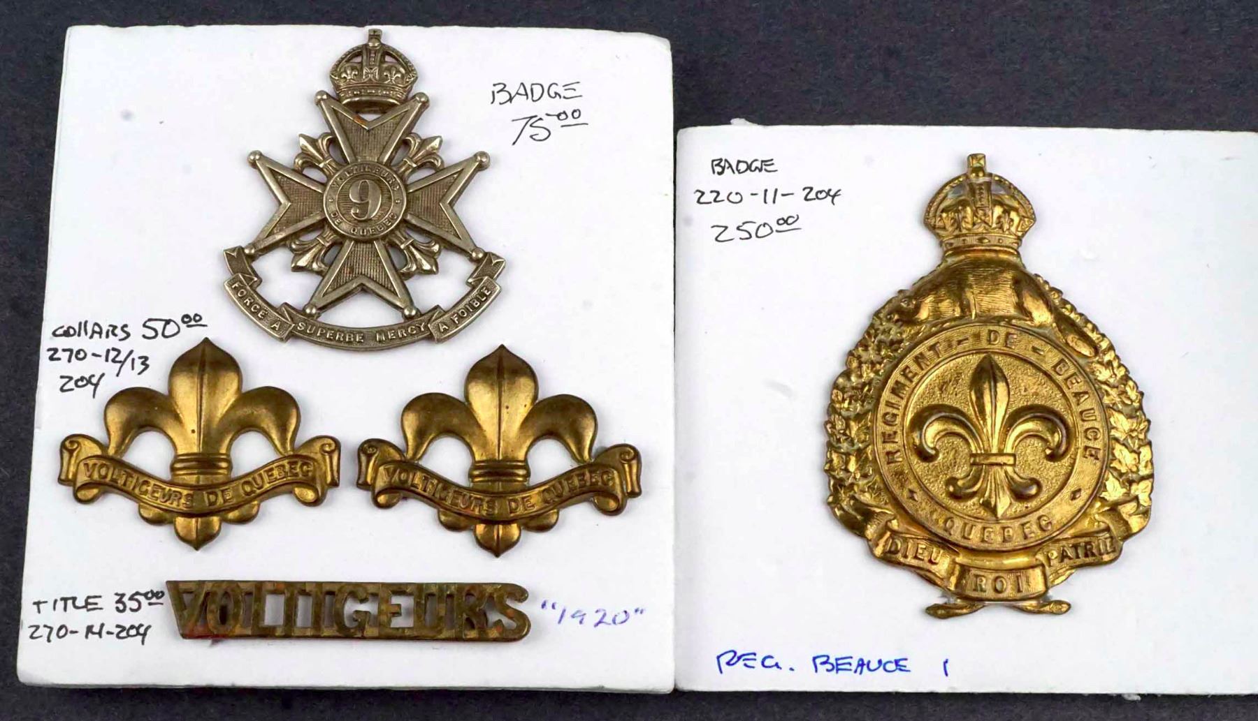 Scarce Régiment de Beauce Badge, missing a lug, and four pieces Voltigeurs de Québec; Badge, Collers, and title.