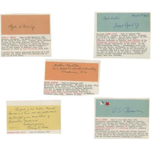 <B>Lot of Five Signatures of Scientific Interest,</B></I> including: <B>Arthur Koehler</B></I> (1885 - 1967) a U.S. federal expert who was important in the investigation of the Lindbergh kidnapping. In the trial of Bruno Hauptmann, Koehler brought out his evidence which helped to indict Hauptmann of the kidnapping and sent Hauptmann to the electric chair. After it was discovered that plank had disappeared from Hauptmann's attic, Koehler brought out his evidence: the wood he traced to Hauptmann. He proved, by fitting the two pieces together, that the attic board matched with the ladder rail used by the kidnapper, giving evidence that Hauptmann built the ladder. His evidence brought to the jury's decision to execute Bruno Hauptmann; <B>Ira Sprague Bowen</B></I> (1898-1973) was an American astronomer. A graduate of Oberlin College and the California Institute of Technology, he taught physics at CalTech from 1921 to 1945. He served as director of both the Mount Wilson Observatory and the Palomar Observatory, holding the latter position until 1964. In 1927 he discovered that Nebulium was not really a chemical element; <B>Florence Rena Sabin</B></I> (1871-1953) an American medical scientist. She was a pioneer for women in science; she was the first woman to hold a full professorship at Johns Hopkins School of Medicine, the first woman elected to the National Academy of Sciences, and the first woman to head a department at the Rockefeller Institute for Medical Research. In her retirement years, she pursued a second career as a public health activist in Colorado; <B>Joseph Lynch</B></I> (1894-1987) director of the Seismographic Station of Fordham University; and, <B>Clyde L. Deming</B></I> (1885-1969) urologist at the Yale University Medical School. All on cards, mounted on stiff card stock with a brief biographical sketch. All very fine. <BR><BR><b>Shipping:</b> Flat Material, Small (<a target="_blank" href="http://www.heritageauctions.com/common/shipping.php">view shipping information</a>)