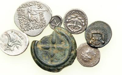 Lot of Five Small Greek Silver Plus Two Greek Bronzes. Each partially described. Lot of 7 coins.